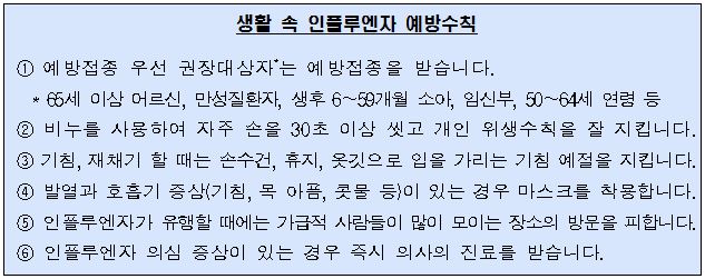 특히, 인플루엔자 우선접종 권장대상자들은 감염 시 폐렴 등 합병증 발생 위험이 높아 질수 있어 예방접종을 받지 않은 경우 반드시 접종해야 한다.