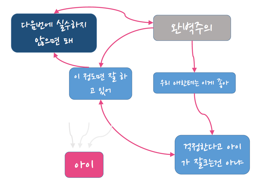 많은 사람들이 부모가 되기 전에는 완벽하게 일을 잘 해왔고, 다른 사람에게 전혀 폐도 끼치지 않고 잘 살았을 겁니다. 또한 집도 깔끔하게 정돈하고 스스로의 완벽함에 흐뭇함을 느꼈을 것 입니다. 부모가 되기 전에는 말입니다. 약간의 완벽주의 성향을 통해 우리는 더 열심히 살았고, 더 좋은 성과를 낼 수도 있었습니다. 하지만 아이를 낳고 나면 전처럼 완벽하게 살기가 어렵다는 건 아이를 키워 본 부모라면 누구나 다 아는 사실입니다. 그런데도 우리는 아이를 키우는 세상 중요한 일에 완벽하고 싶은 욕심이 납니다.