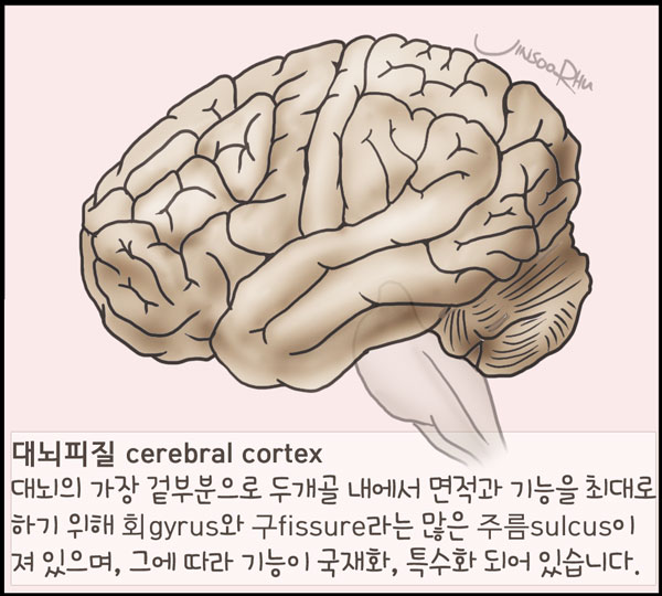 대뇌의 가장 겉부분으로, 두개골 내에서 최대 면적을 갖기 위해, 그리고 기능을 최대로 하기 위해 회gyrus와 구fissure라 불리는 많은 주름sulcus이 져 있으며 그에 따라 기능이 국재화localization 또는 특수화specialization되어 있다. 여기에 뇌신경세포의 70%가 있다.