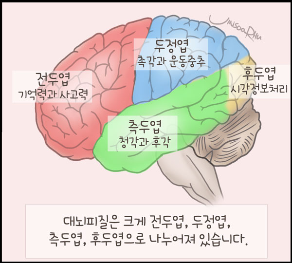 크게 전두엽, 두정엽, 측두엽, 후두엽으로 나누어져 있다. 중앙구central sulcus, fissure of Roland가 전두엽과 두정엽을 구분하고, 측구 lateral cerebral sulcus, sulcus of Sylvius가 전두엽과 측두엽을 구분한다.