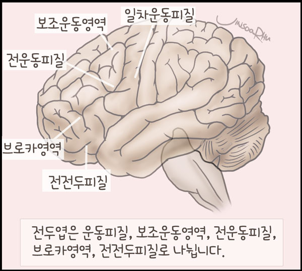전두엽은 운동피질motor strip, 보조운동영역supplementary motor area, 브로카Broca영역, 전전두피질prefrontal cortex로 나뉜다.