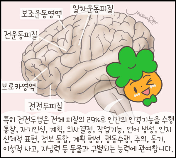 특히 전전두엽prefrontal은 전두엽에서 일차운동피질과 전운동피질을 뺀 전두엽의 앞부분을 말한다. 전체 피질의 29%를 차지하며 인간 고유의 인격기능을 수행하는바, 통찰력, 자기인식, 계획, 의사결정, 작업기억working memory, 언어 생성과 신체적 표현, 여러 정보의 통합, 계획개념(행동의 순서) 형성, 행동수행, 주의, 동기, 인지, 이성적 사고, 지남력 등 인간이 동물과 구별되는 능력에 관여한다. 또한 시상, 변연계, 기저신경절, 그리고 기타 뇌의 여러 부위와 상호연결되어 그 기능들을 통합하고 있는 것으로 추측된다.