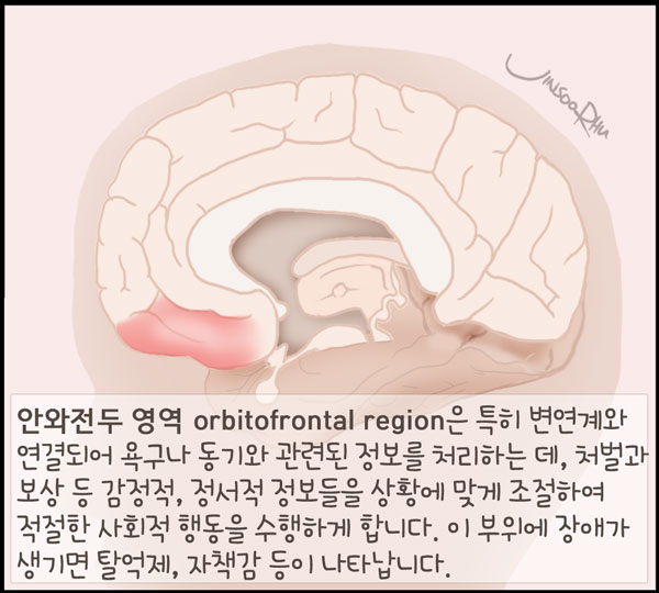 특히 안와전두 영역orbitofrontal region은 특히 변연계와 연결되어 욕구 또는 동기와 관련된 정보를 처리하는 데 관여하는데, 처벌과 보상 등 감정적, 정서적 정보들을 상황에 맞게 조절하여 적절한 사회적 행동을 수행하게 한다.