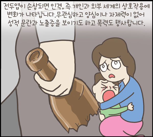 전두엽이 외상, 종양 등으로 손상되면 인격, 즉 개인과 외부 세계와의 상호작요에 변화가 나타난다. 의지, 창조적 문제해결능력, 호기심, 추상능력, 불안정, 계획능력, 사회적 판단 및 결정 능력에 손상이 오고, 손상 위치에 따라 감정적 흥분이나 무감동 등을 나타낸다. 특히 부적절한 행동, 소아 같은 행동 또는 어리석은 행동이 나타난다.