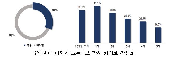 2011년부터 2015년까지「응급실 손상환자 심층조사」에서 수집된 6세 미만의 교통사고 환자를 대상으로 카시트 착용 현황과 효과에 대한 분석결과, 교통사고로 응급실에 내원한 6세 미만 어린이 3,240명 중 31%만이 카시트를 착용하였으며, 연령이 증가할수록 카시트 착용률이 감소했다.