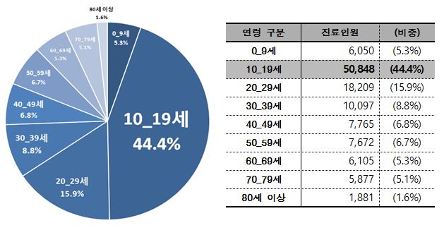 또한 ‘척추측만증’ 진료인원의 44.4%는 10대 청소년으로, 특히 성장기인 13~16세 사이에 진료인원이 많았다.