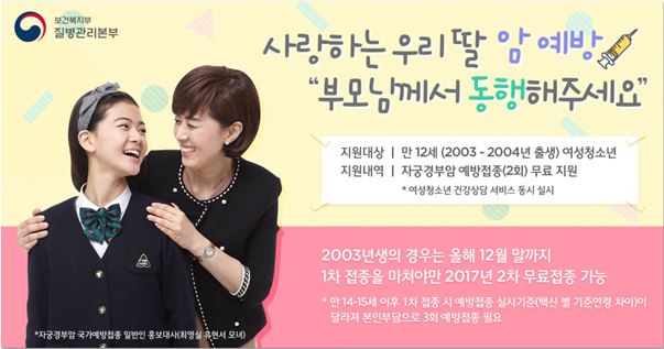 한편, 2017년 1월부터는 2004년1월1일~2005년 12월31일 사이 출생한 여성청소년을 대상으로 자궁경부암 예방접종(2회)이 무료지원 될 예정이다.