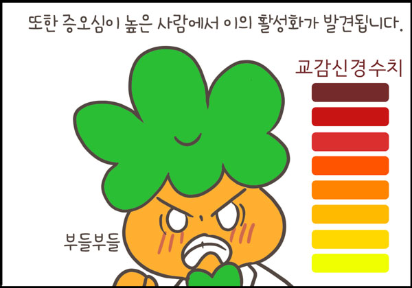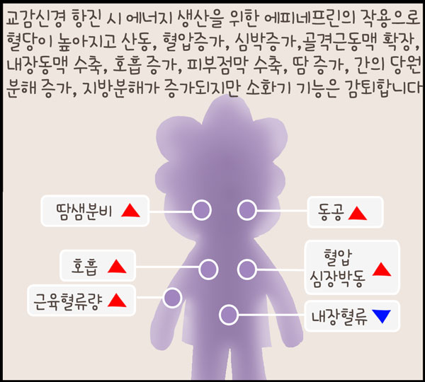 교감신경계와 부교감신경계로 구분된다. 교감신경계는 스트레스에 대항하는 기능, 즉 싸우느냐 도망하느냐라는 과정을 수행한다. 이러한 각성 상태에 따라 에너지를 생산하기 위한 에피네프린의 작용으로 혈중 포도당 농도가 높아지고, 산동, 혈압 증가, 심장박동 증가, 골격근동맥 확장, 내장동맥 수축, 호흡 증가, 피부점막 수축, 땀 증가, 간의 당원분해 증가(혈당 증가), 지방조직의 지방 분해 증가 등이 야기된다. 반면에 소화기계기능은 감퇴된다. 이 기능은 교감신경흥분제(예: 암페타민, 코카인 등)에 의해 유도되며, 진정약물(알코올, 벤조디아제핀, 아편류)의 금단 때도 나타난다. 또한 증오심이 높은 사람에서 이의 활성화가 발견된다.