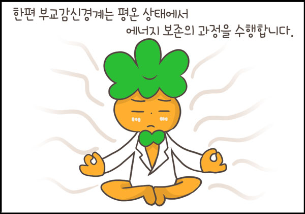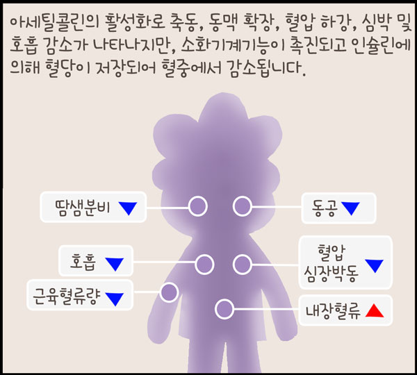 한편 부교감신경계는 평온 상태에서 에너지 보존의 과정을 수행한다. 아세틸콜린 활성화에 의해 축동, 동맥 확장, 혈압 하강, 심장박동 및 호흡 감소가 나타나지만, 소화기계기능이 촉진되고 인슐린에 의해 혈당이 저장되어 혈중에서 감소된다.
