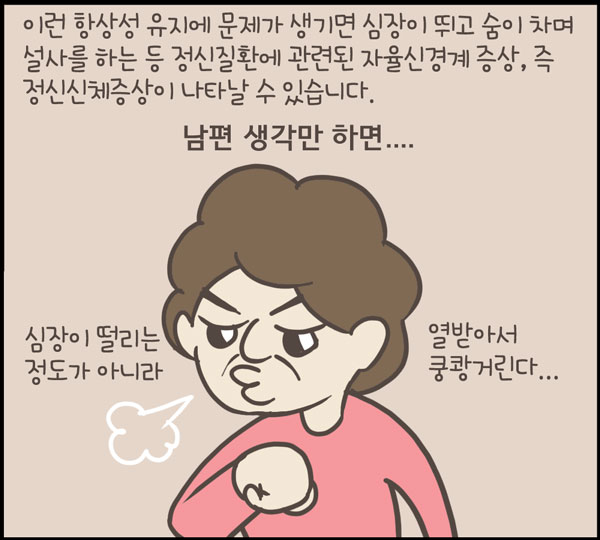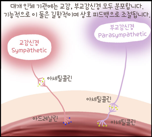 대개 하나의 인체 기관에는 교감, 부교감 두 체계가 다 분포되어 있다. 기능적으로 두 체계는 길항적이며 상호 피드백을 통해 조절된다. 그리하여 일정한 내부환경을 만들어 항상성을 유지하게 된다. 이에 장애가 오면 심장이 뛰고 숨이 차며 설사를 하는 등 정신질환에 관련된 자율 신경계 증상, 즉 정신신체증상이 나타난다. 장기적 장애에 의해 당뇨병, 고혈압 또는 천식과 같은 만성적 정신신체장애가 생길 수 있다.