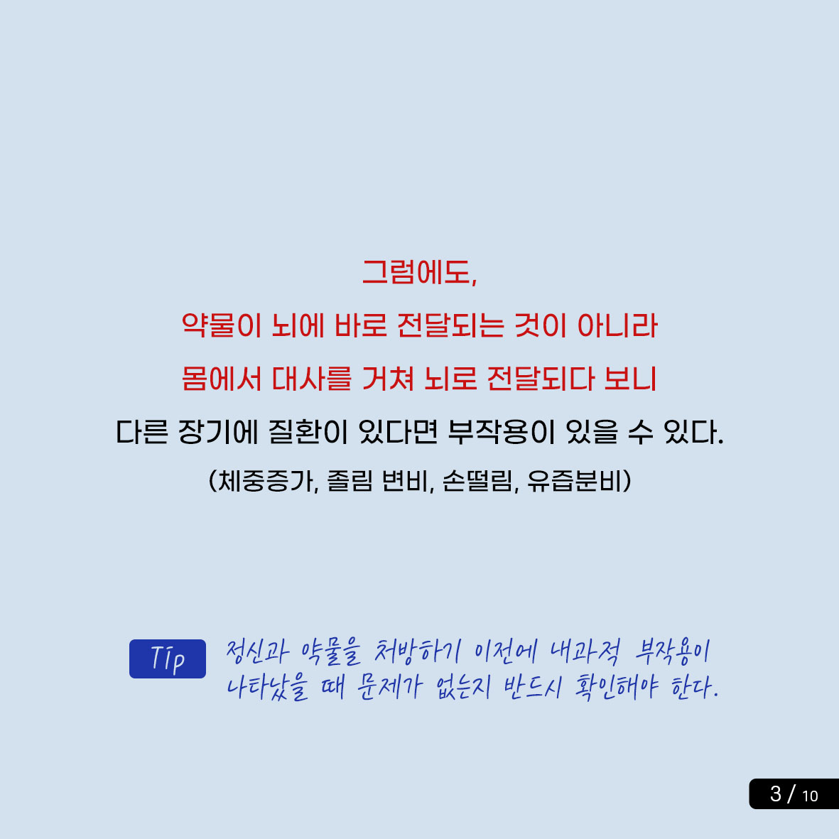 기사 댓글 2 댓글 접기 댓글 내용입력 비회원 로그인 이름 비밀번호 댓글 내용입력 댓글쓰기 계정을 선택하시면 로그인·계정인증을 통해 댓글을 남기실 수 있습니다. 회원 로그인 비회원 글쓰기 이름 비밀번호 자동등록방지 로그인 옵션 창닫기 댓글목록 최신순 추천순 욕설, 타인비방 등의 게시물은 예고 없이 삭제 될 수 있습니다. ㅇ 2020-10-29 09:23:11 더보기 삭제하기 양극성 장애 치료제, 항정신병 치료제와 체중 증가의 연관성은 많은 연구들에서 확인된 사실 아닌가요? 약물 복용이 어떻게 체중 증가로 이어지는지에 대한 기전은 정확하게 밝혀지지 않고 가설들만이 존재하지만 통계가 엄연히 존재하는 걸로 알고 있습니다. 정신과 약물이 전신건강에 끼치는 유해성을 정확하게 고지해야 약물을 복용하고 있는 사람들도 부작용이 일어났을 때 더 잘 대처할 수 있지 않을까요? ㄱ 2020-10-15 22:46:43 더보기 삭제하기 다들 여기까지 어케 옴 근데 이 기사까지?