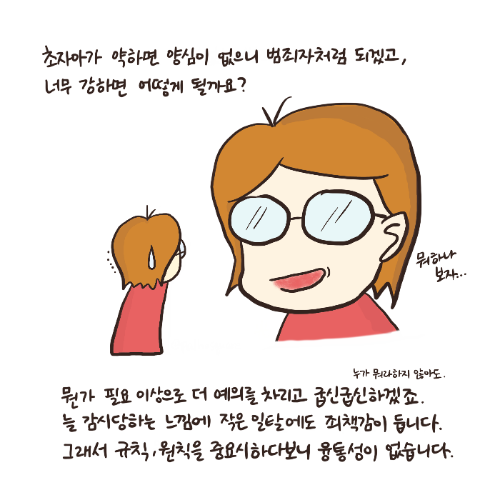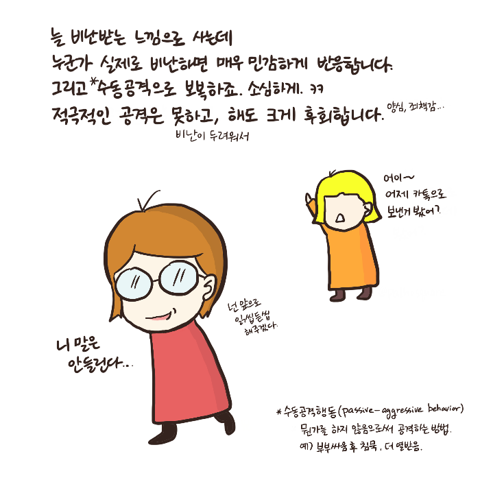 굽신굽신 버럭! 작가의 말 / 마음은 양팔 저울 팔호광장 Instagram @palhosquare 다른기사 보기 저작권자 © 정신의학신문 무단전재 및 재배포 금지 추천 뉴스 매 맞는 여성 증후군 - 사랑이라는 이름의 폭력이 남기는 상처 얼만큼 운동해야 우울증을 예방할까? 약만으로 부족할 때, 우울증에 효과적인 운동은 이것입니다 영웅의 숨겨진 아픔 - 소방관 트라우마 불안이 쉽게 사라지지 않는 뇌과학적 이유 [신간소개] 당신의 상처는 사적이지 않다 수면다원검사를 꼭 받아봐야 하는 사람 (Part 3) 우울증에 좋은 운동은 뭘까 댓글삭제 삭제한 댓글은 다시 복구할 수 없습니다. 그래도 삭제하시겠습니까? 비밀번호 닫기 기사 댓글 3 댓글 접기 댓글 내용입력 비회원 로그인 이름 비밀번호 댓글 내용입력 댓글쓰기 계정을 선택하시면 로그인·계정인증을 통해 댓글을 남기실 수 있습니다. 회원 로그인 비회원 글쓰기 이름 비밀번호 자동등록방지 로그인 옵션 창닫기 댓글목록 최신순 추천순 욕설, 타인비방 등의 게시물은 예고 없이 삭제 될 수 있습니다. 그런거 같습니다. 2021-07-29 22:43:31 더보기 삭제하기 제가 좀 그런거 같아요 앞으로 좀 고쳐 나가야 할 것 같아 치치 2021-01-23 18:54:30 더보기 삭제하기 저도 조금 그런 편인 것 같아요. 융통성이 많이 부족하고 재치도 없고. 상황을 좀 더 유연하게 받아들이려는 노력을 해야겠네요. 아이고 2020-10-30 18:00:40 더보기 삭제하기 너무 정확하게 난데.... 주요기사 대인기피증 사회불안장애 극복하기 [Doctor's Mail] 연속된 사업 실패, 재기를 위해 노력하지만 힘듭니다 아직은 괜찮습니다 6화 나는 언제나 완성되어가는 중이다 불안장애와 공황장애 어떻게 다른가요 수면의 질과 ADHD의 상호작용 약만으로 부족할 때, 우울증에 효과적인 운동은 이것입니다
