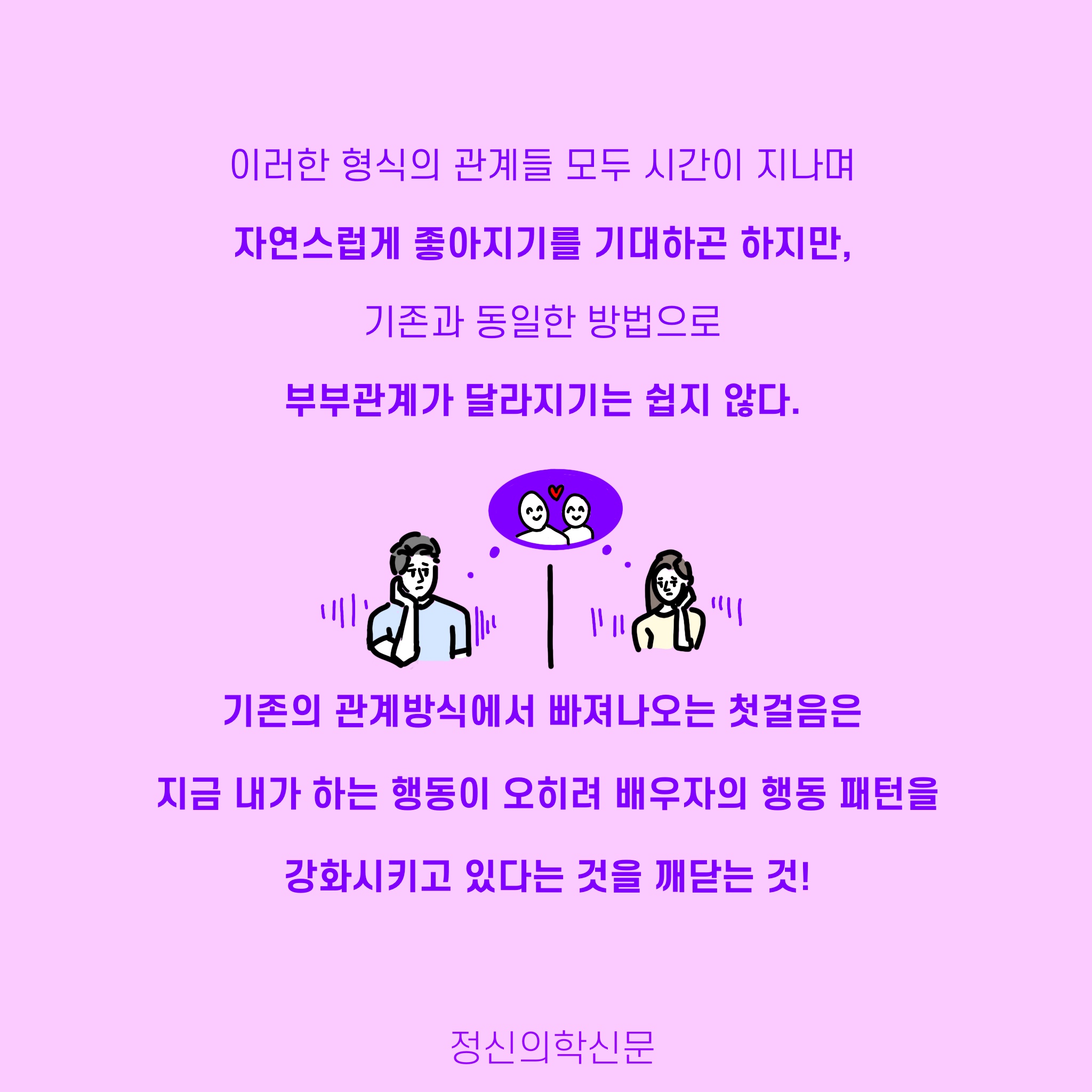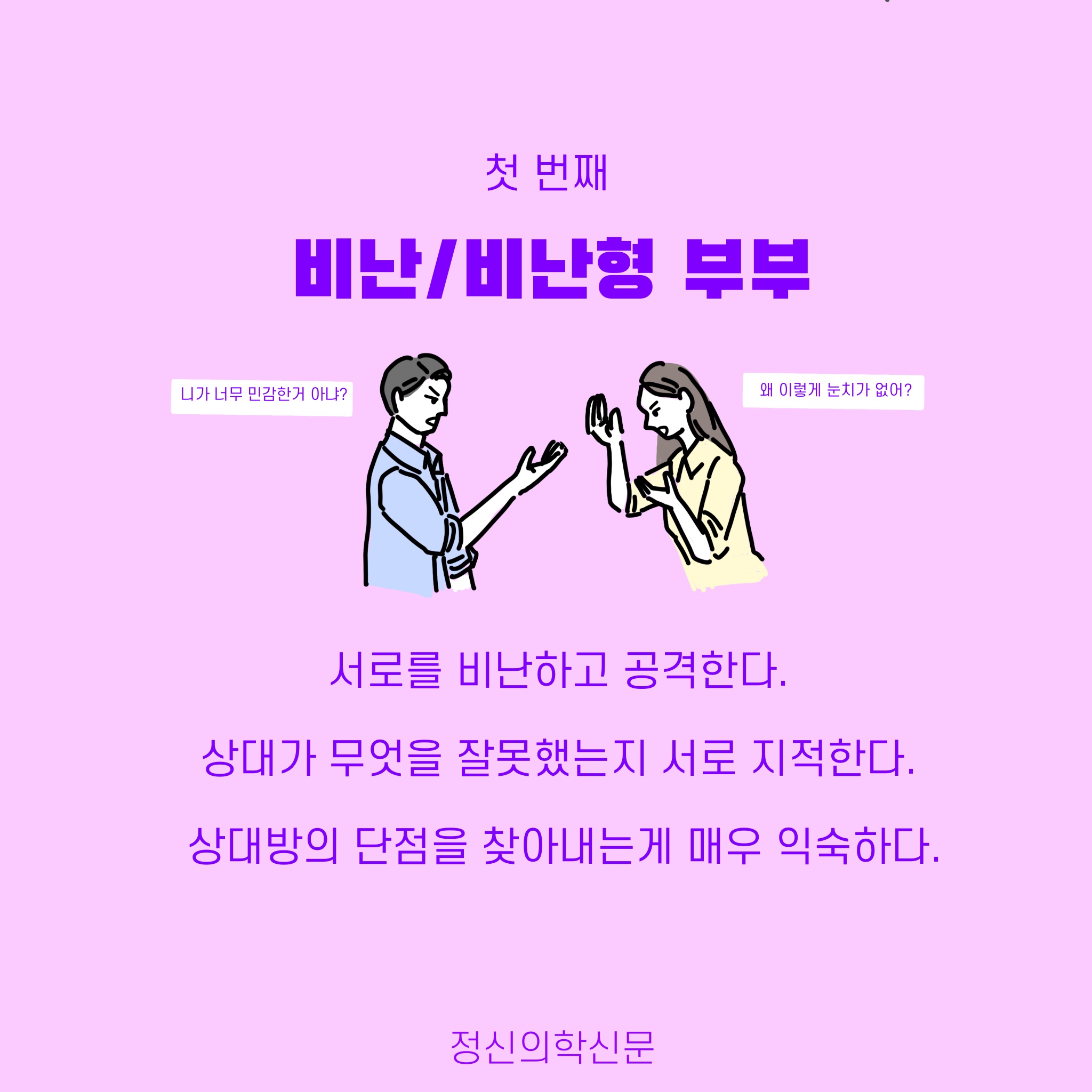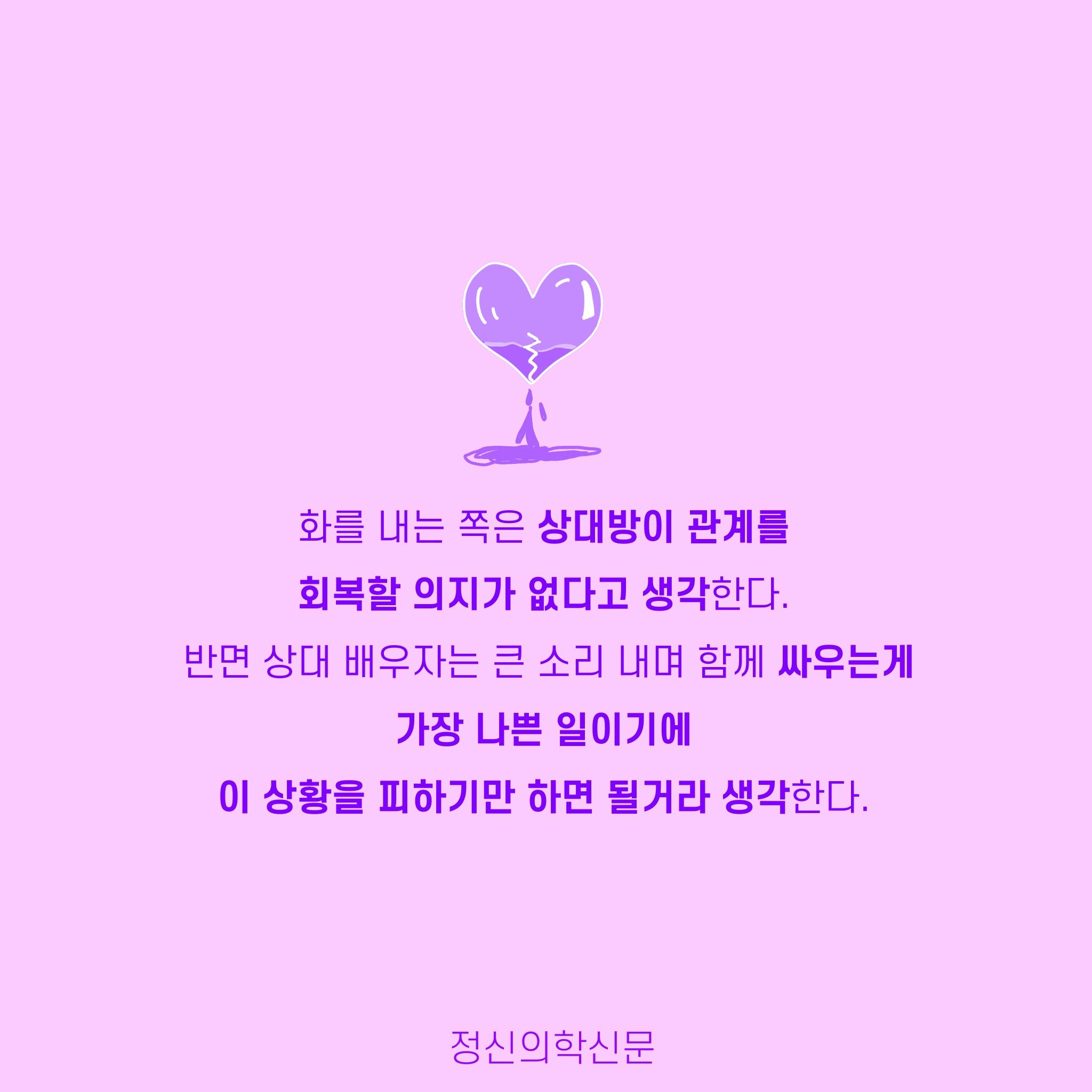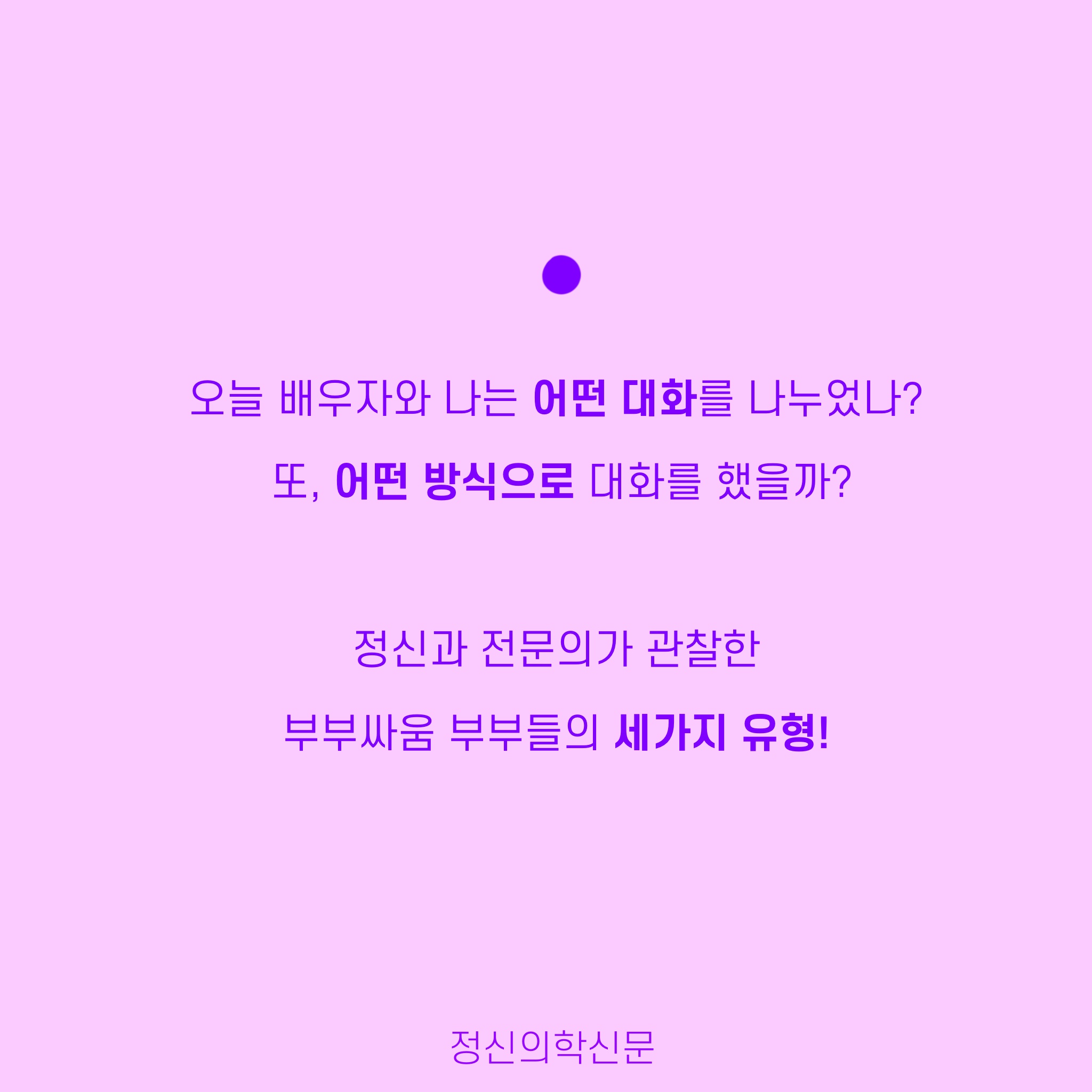 원문 보기 : 부부의 세 가지 부정적 대화방식 관련기사 부모님의 잦은 다툼으로 힘들어하는 분들에게 신혼부부 대화 3분 듣고 이혼율을 예측할 수 있다? 매일 반복되는 지긋지긋한 말다툼, 멈추는 방법은? 한승민 정신건강의학과 전문의 info.psynews@gmail.com 저작권자 © 정신의학신문 무단전재 및 재배포 금지 추천 뉴스 매 맞는 여성 증후군 - 사랑이라는 이름의 폭력이 남기는 상처 얼만큼 운동해야 우울증을 예방할까? 영웅의 숨겨진 아픔 - 소방관 트라우마 약만으로 부족할 때, 우울증에 효과적인 운동은 이것입니다 불안이 쉽게 사라지지 않는 뇌과학적 이유 [신간소개] 당신의 상처는 사적이지 않다 수면다원검사를 꼭 받아봐야 하는 사람 (Part 3) 우울증에 좋은 운동은 뭘까 댓글삭제 삭제한 댓글은 다시 복구할 수 없습니다. 그래도 삭제하시겠습니까? 비밀번호 닫기 기사 댓글 0 댓글 접기 댓글 내용입력 비회원 로그인 이름 비밀번호 댓글 내용입력 댓글쓰기 계정을 선택하시면 로그인·계정인증을 통해 댓글을 남기실 수 있습니다. 회원 로그인 비회원 글쓰기 이름 비밀번호 자동등록방지 로그인 옵션 창닫기 주요기사 대인기피증 사회불안장애 극복하기 [Doctor's Mail] 연속된 사업 실패, 재기를 위해 노력하지만 힘듭니다 아직은 괜찮습니다 6화 나는 언제나 완성되어가는 중이다 불안장애와 공황장애 어떻게 다른가요 수면의 질과 ADHD의 상호작용 약만으로 부족할 때, 우울증에 효과적인 운동은 이것입니다