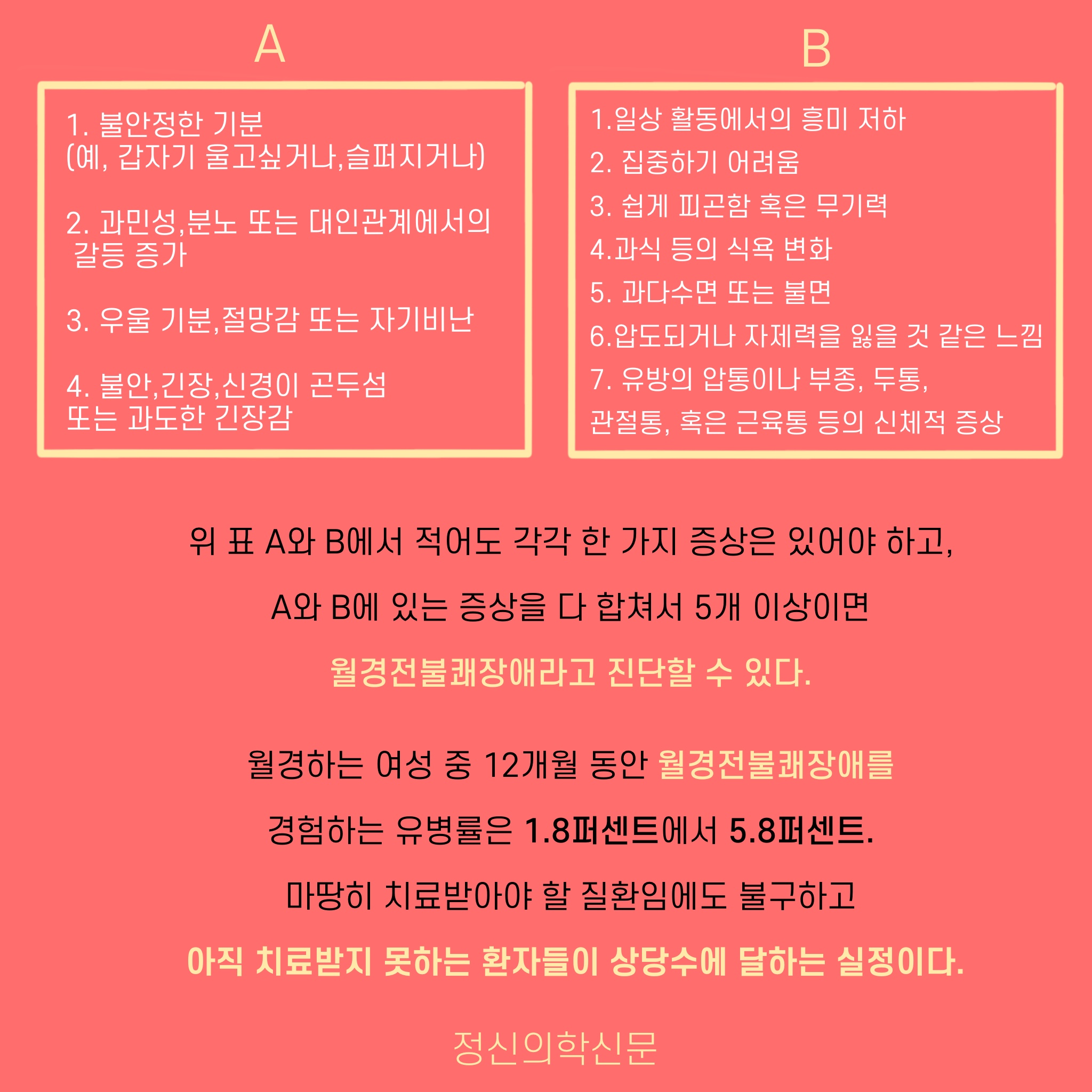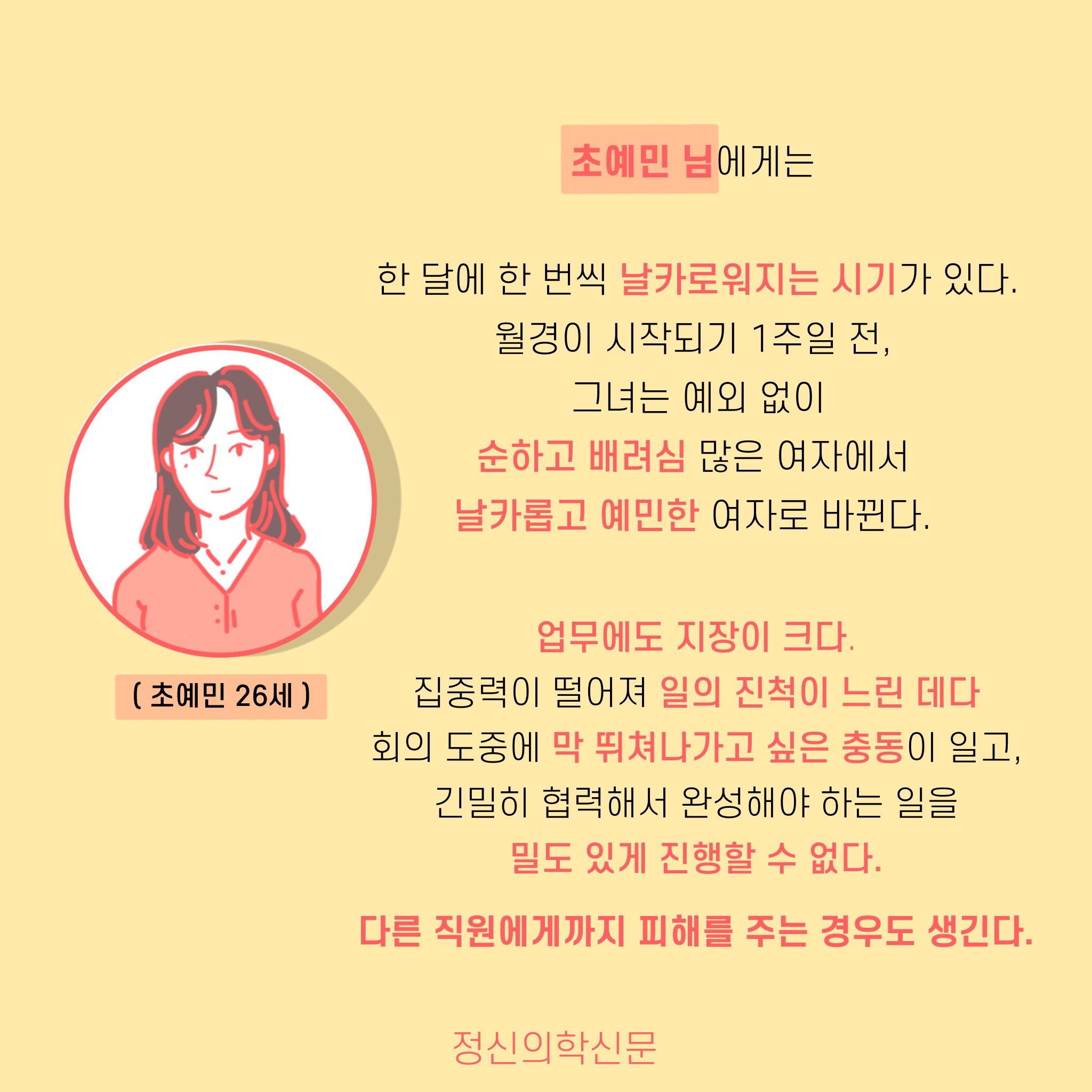 조장원 정신건강의학과 전문의 민트 정신건강의학과 원장 원문 보기 : 월경전불쾌장애, ‘그날’이라고 다 같은 ‘그날’이 아니다 조장원 정신건강의학과 전문의 민트 정신건강의학과 원장 한양대학교 의과대학 학사, 석사, 전공의 대한신경정신의학회 정회원 저서 <나를 지키는 심리학> 전문의 홈 가기 조장원 전문의의 대표칼럼 정신과 약을 복용하는 군인, 어떤 생각이 드시나요? 정신과 약을 복용하는 군인, 어떤 생각이 드시나요? [카드뉴스] 인생이 잘 안 풀리는 사람들의 무의식적인 말버릇 [카드뉴스] 젊은 꼰대 - 수직적 인간관계에 익숙한 사람들 [카드뉴스] 유독 걱정이 많은 사람이 기억하면 좋을 습관 퇴근 후 만사가 귀찮고 재미없다면? 조장원 정신건강의학과 전문의 info.psynews@gmail.com 다른기사 보기 저작권자 © 정신의학신문 무단전재 및 재배포 금지 추천 뉴스 매 맞는 여성 증후군 - 사랑이라는 이름의 폭력이 남기는 상처 얼만큼 운동해야 우울증을 예방할까? 약만으로 부족할 때, 우울증에 효과적인 운동은 이것입니다 영웅의 숨겨진 아픔 - 소방관 트라우마 불안이 쉽게 사라지지 않는 뇌과학적 이유 [신간소개] 당신의 상처는 사적이지 않다 수면다원검사를 꼭 받아봐야 하는 사람 (Part 3) 우울증에 좋은 운동은 뭘까 댓글삭제 삭제한 댓글은 다시 복구할 수 없습니다. 그래도 삭제하시겠습니까? 비밀번호 닫기 기사 댓글 0 댓글 접기 댓글 내용입력 비회원 로그인 이름 비밀번호 댓글 내용입력 댓글쓰기 계정을 선택하시면 로그인·계정인증을 통해 댓글을 남기실 수 있습니다. 회원 로그인 비회원 글쓰기 이름 비밀번호 자동등록방지 로그인 옵션 창닫기 주요기사 대인기피증 사회불안장애 극복하기 [Doctor's Mail] 연속된 사업 실패, 재기를 위해 노력하지만 힘듭니다 아직은 괜찮습니다 6화 나는 언제나 완성되어가는 중이다 불안장애와 공황장애 어떻게 다른가요 수면의 질과 ADHD의 상호작용 약만으로 부족할 때, 우울증에 효과적인 운동은 이것입니다