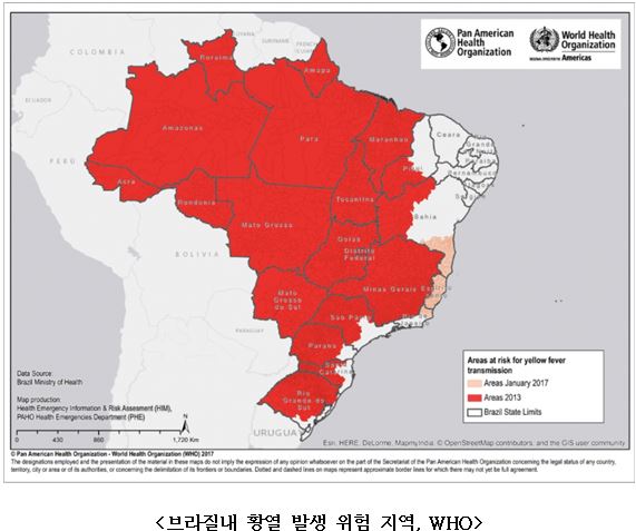 황열은 브라질 내에서 풍토병으로 매년 12월부터 다음해 5월까지 주로 발생하고 있어 당분간 황열 감염 사례 발생은 지속될 것으로 예상하고 있다.