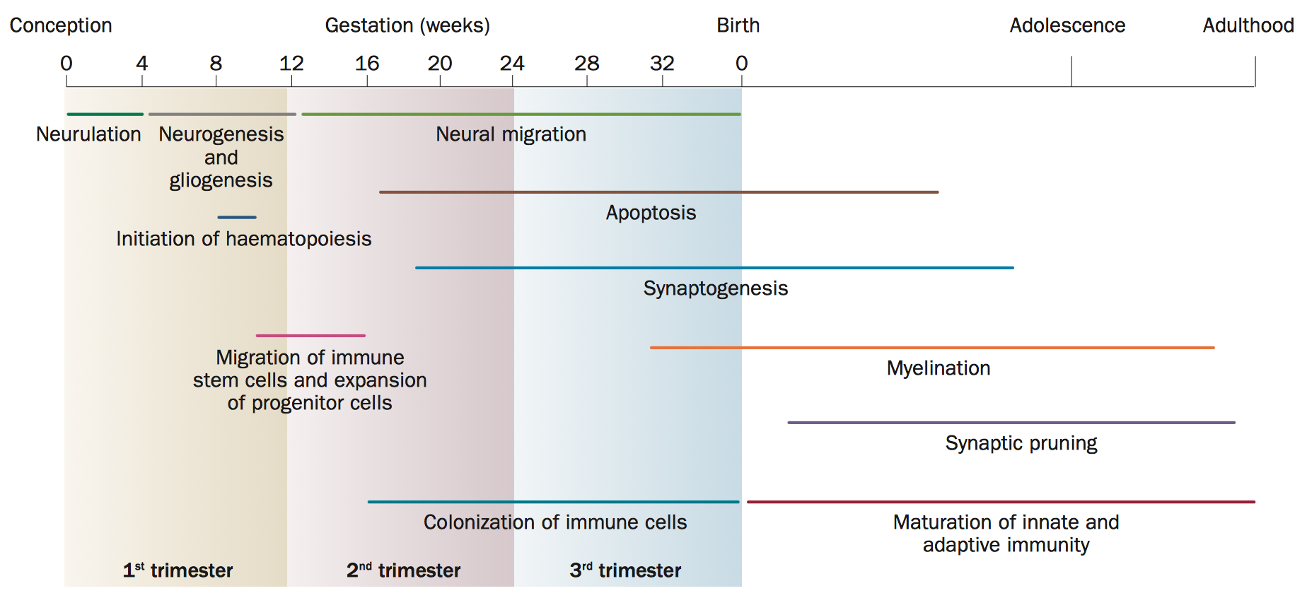 아이의 뇌 성장에 대한 시간적 변화는 아래 그림과 같습니다 (그림2). 뇌는 태어나기 전에 빠르게 성장하고 4세 가량에 성인 뇌의 90%에 달하는 무게에 이릅니다. 사람의 뇌는 태어나면서 이미 신경세포는 만들어져 정해진 위치에 존재하지만, 그 연결은 아직 완전하지 않습니다. 심지어 뇌에서는 만 30세에 이르러서도 연결이 수정되고 다듬어져 갑니다.