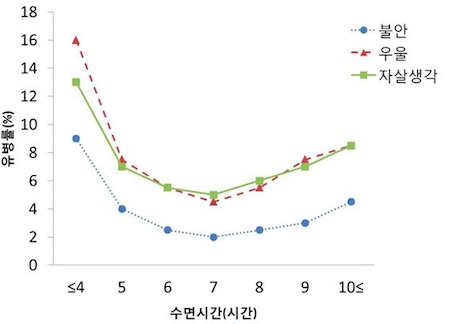 분석 결과 7시간을 기준으로 수면시간이 짧을수록 우울, 불안, 자살생각 등이 가파르게 상승했고, 7시간보다 길어질 때 역시 완만하기는 하지만 관련 수치가 증가했다. 4시간 이하 수면한 그룹의 불안, 우울, 자살생각 유병률은 각각 9.1%, 16.0%, 12.7%인 반면, 7시간 수면을 취한 그룹의 경우 각각 2.0%, 4.3%, 5.0%에 불과했다. 수면시간이 4시간 이하로 떨어질 경우 불안의 발생 확률은 4배, 우울은 3.7%, 자살생각은 2.5배 높아진 것이다.