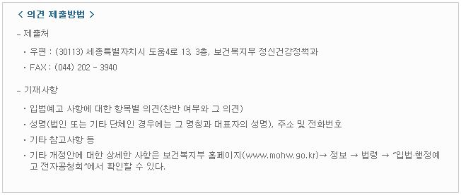 이번 개정안에 대하여 의견이 있는 단체 또는 개인은 2017년 4월 11일까지 보건복지부 정신건강정책과로 의견을 제출할 수 있다.