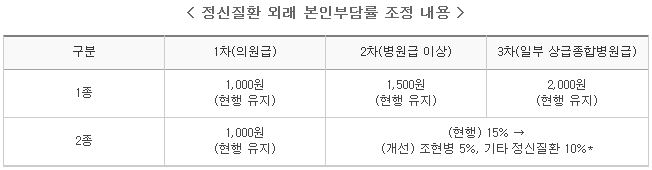 이와 병행하여 최근 우울증 등 주요 정신질환 유병율의 빠른 증가와 높은 자살율 등의 상황을 감안해 정신질환의 초기 단계부터 적극적인 정신과 외래 진료를 받을 수 있도록 외래 본인부담율을 건강보험의 1/2 수준으로 조정했다.