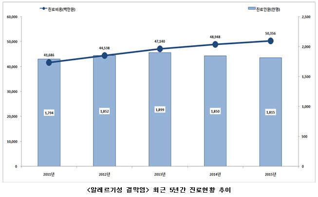 ‘알레르기성 결막염’은 여성 진료인원이 남성 진료인원보다 약 1.5배 많았으며, 1인당 진료비용은 2015년 기준 약 2만 8천원으로 나타났다.