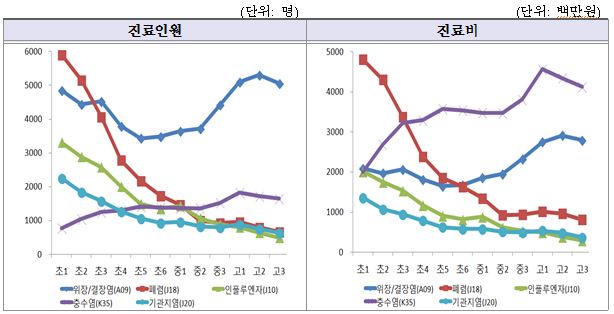 특히 폐렴 등 호흡기계 질환은 학년이 높아질수록 진료인원과 진료비가 감소하는 추세를 보였으나, 충수염 등 위장질환은 학년이 높아질수록 진료인원과 진료비도 증가하는 추세를 보였다.