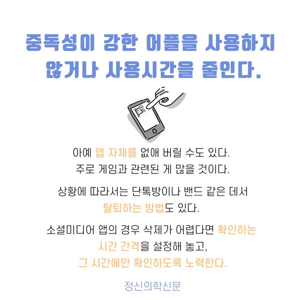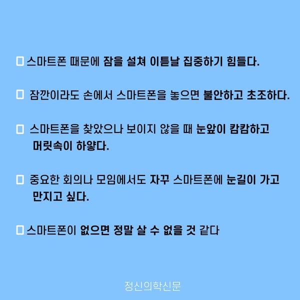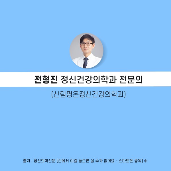 전형진 정신건강의학과 전문의 신림평온 정신건강의학과 원장 원문 보기 : 손에서 이걸 놓으면 살 수가 없어요 - 스마트폰 중독 전형진 정신건강의학과 전문의 신림평온 정신건강의학과 원장 충남대학교 의과대학 졸업 국립공주병원 전공의 수료 대한신경정신의학회 정회원 전문의 홈 가기 전형진 전문의의 대표칼럼 스트레스가 몸으로 나타나는 신체화 증상의 이해와 관리 당연하게 하던 일들이 안 될 때 - 슬럼프와 입스 편집증 좋은 일이 있을 거라는 상상, 이미지 트레이닝 대중화된 MBTI 유형과 실제 정신의학의 차이 [Doctor's Mail] 공부하기 위해 ADHD약을 먹어도 문제없을까요? 관련기사 스마트폰이 뇌에 미치는 영향 [스마트폰 중독] 스마트폰 중독에서 벗어나고 싶다면? 키워드 #스마트폰 #스마트폰중독 전형진 정신건강의학과 전문의 info.psynews@gmail.com 다른기사 보기 저작권자 © 정신의학신문 무단전재 및 재배포 금지 추천 뉴스 매 맞는 여성 증후군 - 사랑이라는 이름의 폭력이 남기는 상처 얼만큼 운동해야 우울증을 예방할까? 약만으로 부족할 때, 우울증에 효과적인 운동은 이것입니다 영웅의 숨겨진 아픔 - 소방관 트라우마 불안이 쉽게 사라지지 않는 뇌과학적 이유 [신간소개] 당신의 상처는 사적이지 않다 수면다원검사를 꼭 받아봐야 하는 사람 (Part 3) 우울증에 좋은 운동은 뭘까 댓글삭제 삭제한 댓글은 다시 복구할 수 없습니다. 그래도 삭제하시겠습니까? 비밀번호 닫기 기사 댓글 0 댓글 접기 댓글 내용입력 비회원 로그인 이름 비밀번호 댓글 내용입력 댓글쓰기 계정을 선택하시면 로그인·계정인증을 통해 댓글을 남기실 수 있습니다. 회원 로그인 비회원 글쓰기 이름 비밀번호 자동등록방지 로그인 옵션 창닫기 주요기사 대인기피증 사회불안장애 극복하기 [Doctor's Mail] 연속된 사업 실패, 재기를 위해 노력하지만 힘듭니다 아직은 괜찮습니다 6화 나는 언제나 완성되어가는 중이다 불안장애와 공황장애 어떻게 다른가요 수면의 질과 ADHD의 상호작용 약만으로 부족할 때, 우울증에 효과적인 운동은 이것입니다