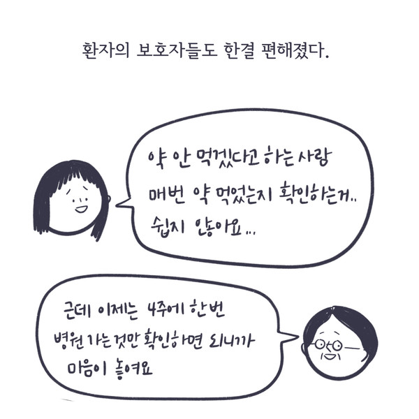 관련기사 2. 재발 막는 조현병 관리를 위하여! (장기지속형 주사제, 조현병 치료) 1. 조현병이 있으면 아무것도 못한다고? (조현병 증상, 재발, 치료) 키워드 #조현병 #조현병치료 #조현병증상 서밤 info.psynews@gmail.com 다른기사 보기 저작권자 © 정신의학신문 무단전재 및 재배포 금지 추천 뉴스 매 맞는 여성 증후군 - 사랑이라는 이름의 폭력이 남기는 상처 얼만큼 운동해야 우울증을 예방할까? 영웅의 숨겨진 아픔 - 소방관 트라우마 약만으로 부족할 때, 우울증에 효과적인 운동은 이것입니다 불안이 쉽게 사라지지 않는 뇌과학적 이유 [신간소개] 당신의 상처는 사적이지 않다 수면다원검사를 꼭 받아봐야 하는 사람 (Part 3) 우울증에 좋은 운동은 뭘까 댓글삭제 삭제한 댓글은 다시 복구할 수 없습니다. 그래도 삭제하시겠습니까? 비밀번호 닫기 기사 댓글 0 댓글 접기 댓글 내용입력 비회원 로그인 이름 비밀번호 댓글 내용입력 댓글쓰기 계정을 선택하시면 로그인·계정인증을 통해 댓글을 남기실 수 있습니다. 회원 로그인 비회원 글쓰기 이름 비밀번호 자동등록방지 로그인 옵션 창닫기 주요기사 대인기피증 사회불안장애 극복하기 [Doctor's Mail] 연속된 사업 실패, 재기를 위해 노력하지만 힘듭니다 아직은 괜찮습니다 6화 나는 언제나 완성되어가는 중이다 불안장애와 공황장애 어떻게 다른가요 수면의 질과 ADHD의 상호작용 약만으로 부족할 때, 우울증에 효과적인 운동은 이것입니다