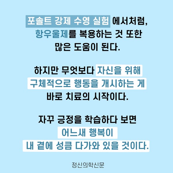 정신과 약을 복용하는 군인, 어떤 생각이 드시나요? [카드뉴스] 인생이 잘 안 풀리는 사람들의 무의식적인 말버릇 [카드뉴스] 젊은 꼰대 - 수직적 인간관계에 익숙한 사람들 [카드뉴스] 유독 걱정이 많은 사람이 기억하면 좋을 습관 퇴근 후 만사가 귀찮고 재미없다면?