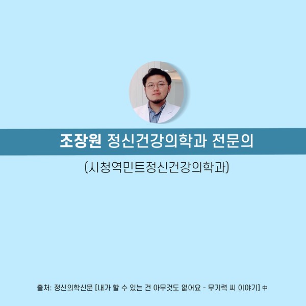 조장원 정신건강의학과 전문의 민트 정신건강의학과 원장 원문 보기 : 내가 할 수 있는 건 아무것도 없어요 - 무기력 씨 이야기 조장원 정신건강의학과 전문의 민트 정신건강의학과 원장 한양대학교 의과대학 학사, 석사, 전공의 대한신경정신의학회 정회원 저서 <나를 지키는 심리학> 전문의 홈 가기 조장원 전문의의 대표칼럼 정신과 약을 복용하는 군인, 어떤 생각이 드시나요? 정신과 약을 복용하는 군인, 어떤 생각이 드시나요? [카드뉴스] 인생이 잘 안 풀리는 사람들의 무의식적인 말버릇 [카드뉴스] 젊은 꼰대 - 수직적 인간관계에 익숙한 사람들 [카드뉴스] 유독 걱정이 많은 사람이 기억하면 좋을 습관 퇴근 후 만사가 귀찮고 재미없다면? 조장원 정신건강의학과 전문의 info.psynews@gmail.com 다른기사 보기 저작권자 © 정신의학신문 무단전재 및 재배포 금지 추천 뉴스 매 맞는 여성 증후군 - 사랑이라는 이름의 폭력이 남기는 상처 얼만큼 운동해야 우울증을 예방할까? 약만으로 부족할 때, 우울증에 효과적인 운동은 이것입니다 영웅의 숨겨진 아픔 - 소방관 트라우마 불안이 쉽게 사라지지 않는 뇌과학적 이유 [신간소개] 당신의 상처는 사적이지 않다 수면다원검사를 꼭 받아봐야 하는 사람 (Part 3) 우울증에 좋은 운동은 뭘까 댓글삭제 삭제한 댓글은 다시 복구할 수 없습니다. 그래도 삭제하시겠습니까? 비밀번호 닫기 기사 댓글 0 댓글 접기 댓글 내용입력 비회원 로그인 이름 비밀번호 댓글 내용입력 댓글쓰기 계정을 선택하시면 로그인·계정인증을 통해 댓글을 남기실 수 있습니다. 회원 로그인 비회원 글쓰기 이름 비밀번호 자동등록방지 로그인 옵션 창닫기 주요기사 대인기피증 사회불안장애 극복하기 [Doctor's Mail] 연속된 사업 실패, 재기를 위해 노력하지만 힘듭니다 아직은 괜찮습니다 6화 나는 언제나 완성되어가는 중이다 불안장애와 공황장애 어떻게 다른가요 수면의 질과 ADHD의 상호작용 약만으로 부족할 때, 우울증에 효과적인 운동은 이것입니다