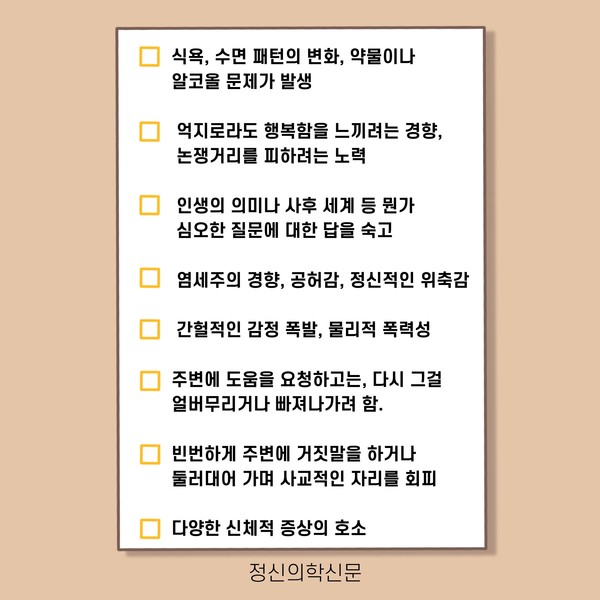 추천 뉴스 매 맞는 여성 증후군 - 사랑이라는 이름의 폭력이 남기는 상처 얼만큼 운동해야 우울증을 예방할까? 영웅의 숨겨진 아픔 - 소방관 트라우마 약만으로 부족할 때, 우울증에 효과적인 운동은 이것입니다 불안이 쉽게 사라지지 않는 뇌과학적 이유 [신간소개] 당신의 상처는 사적이지 않다 수면다원검사를 꼭 받아봐야 하는 사람 (Part 3)