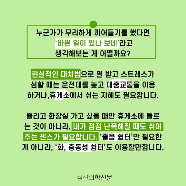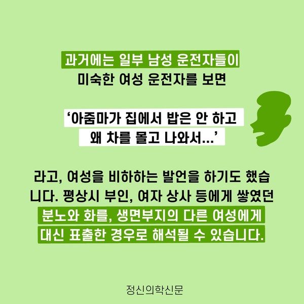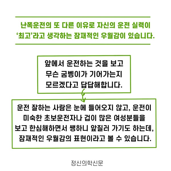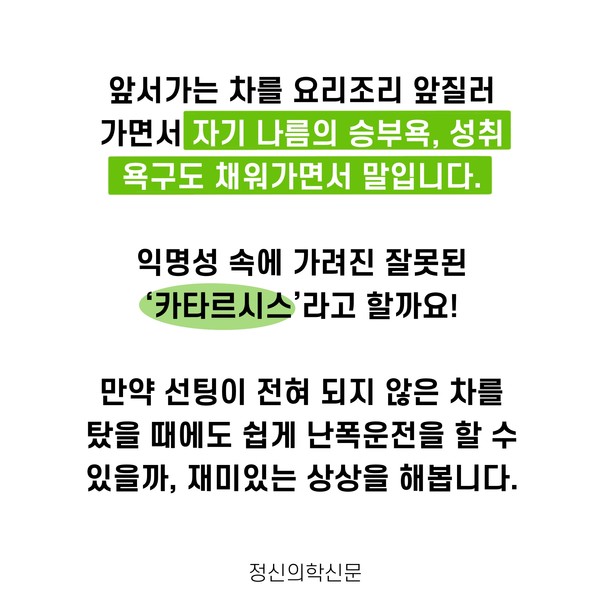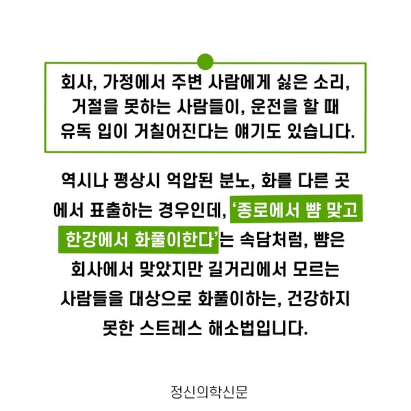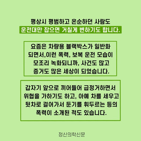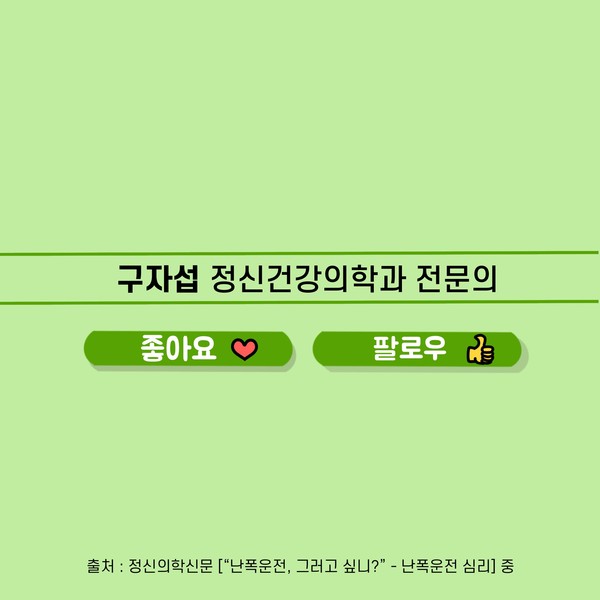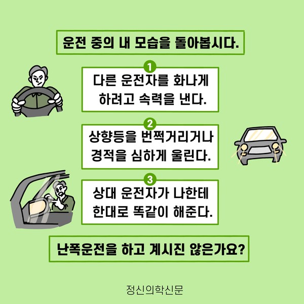 관련기사 “난폭운전, 그러고 싶니?” - 난폭운전 심리 구자섭 정신건강의학과 전문의 info.psynews@gmail.com 다른기사 보기 저작권자 © 정신의학신문 무단전재 및 재배포 금지 추천 뉴스 매 맞는 여성 증후군 - 사랑이라는 이름의 폭력이 남기는 상처 얼만큼 운동해야 우울증을 예방할까? 약만으로 부족할 때, 우울증에 효과적인 운동은 이것입니다 영웅의 숨겨진 아픔 - 소방관 트라우마 불안이 쉽게 사라지지 않는 뇌과학적 이유 [신간소개] 당신의 상처는 사적이지 않다 수면다원검사를 꼭 받아봐야 하는 사람 (Part 3) 우울증에 좋은 운동은 뭘까 댓글삭제 삭제한 댓글은 다시 복구할 수 없습니다. 그래도 삭제하시겠습니까? 비밀번호 닫기 기사 댓글 0 댓글 접기 댓글 내용입력 비회원 로그인 이름 비밀번호 댓글 내용입력 댓글쓰기 계정을 선택하시면 로그인·계정인증을 통해 댓글을 남기실 수 있습니다. 회원 로그인 비회원 글쓰기 이름 비밀번호 자동등록방지 로그인 옵션 창닫기 주요기사 대인기피증 사회불안장애 극복하기 [Doctor's Mail] 연속된 사업 실패, 재기를 위해 노력하지만 힘듭니다 아직은 괜찮습니다 6화 나는 언제나 완성되어가는 중이다 불안장애와 공황장애 어떻게 다른가요 수면의 질과 ADHD의 상호작용 약만으로 부족할 때, 우울증에 효과적인 운동은 이것입니다
