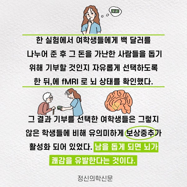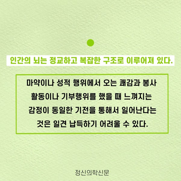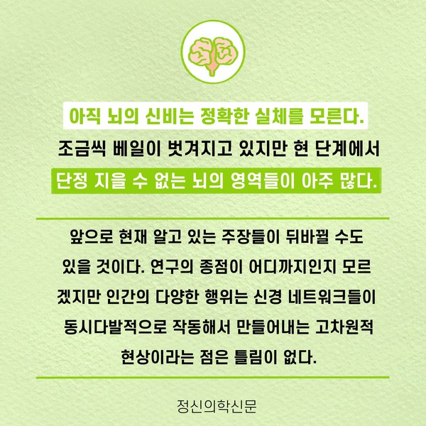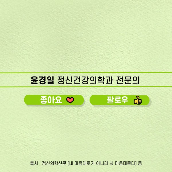 관련기사 내 마음대로가 아니라 뇌 마음대로다 윤경일 정신건강의학과 전문의 info.psynews@gmail.com 다른기사 보기 저작권자 © 정신의학신문 무단전재 및 재배포 금지 추천 뉴스 매 맞는 여성 증후군 - 사랑이라는 이름의 폭력이 남기는 상처 얼만큼 운동해야 우울증을 예방할까? 영웅의 숨겨진 아픔 - 소방관 트라우마 약만으로 부족할 때, 우울증에 효과적인 운동은 이것입니다 불안이 쉽게 사라지지 않는 뇌과학적 이유 [신간소개] 당신의 상처는 사적이지 않다 수면다원검사를 꼭 받아봐야 하는 사람 (Part 3) 우울증에 좋은 운동은 뭘까 댓글삭제 삭제한 댓글은 다시 복구할 수 없습니다. 그래도 삭제하시겠습니까? 비밀번호 닫기 기사 댓글 1 댓글 접기 댓글 내용입력 비회원 로그인 이름 비밀번호 댓글 내용입력 댓글쓰기 계정을 선택하시면 로그인·계정인증을 통해 댓글을 남기실 수 있습니다. 회원 로그인 비회원 글쓰기 이름 비밀번호 자동등록방지 로그인 옵션 창닫기 댓글목록 최신순 추천순 욕설, 타인비방 등의 게시물은 예고 없이 삭제 될 수 있습니다. 김준형 2021-02-03 22:38:22 더보기 삭제하기 좋다! 주요기사 대인기피증 사회불안장애 극복하기 [Doctor's Mail] 연속된 사업 실패, 재기를 위해 노력하지만 힘듭니다 아직은 괜찮습니다 6화 나는 언제나 완성되어가는 중이다 불안장애와 공황장애 어떻게 다른가요 수면의 질과 ADHD의 상호작용 약만으로 부족할 때, 우울증에 효과적인 운동은 이것입니다