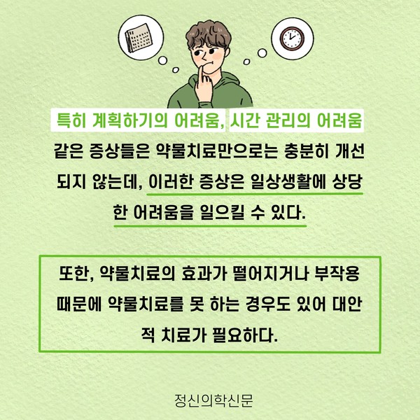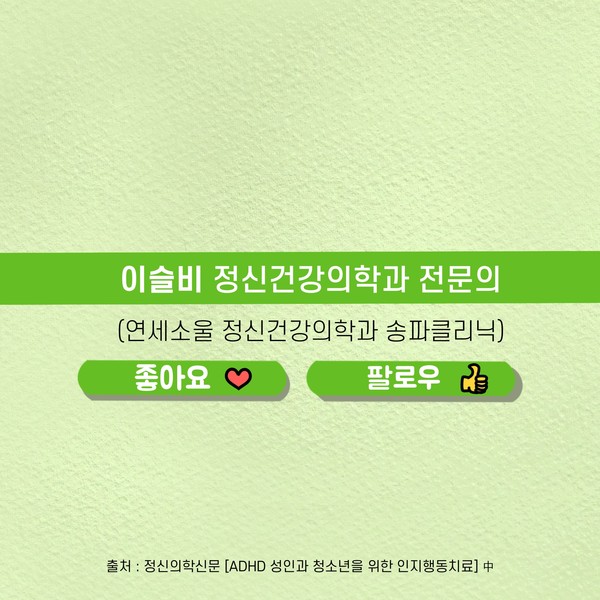 관련기사 ADHD 성인과 청소년을 위한 인지행동치료 키워드 #ADHD #주의력결핍 이슬비 정신건강의학과 전문의 info.psynews@gmail.com 다른기사 보기 저작권자 © 정신의학신문 무단전재 및 재배포 금지 추천 뉴스 매 맞는 여성 증후군 - 사랑이라는 이름의 폭력이 남기는 상처 얼만큼 운동해야 우울증을 예방할까? 약만으로 부족할 때, 우울증에 효과적인 운동은 이것입니다 영웅의 숨겨진 아픔 - 소방관 트라우마 불안이 쉽게 사라지지 않는 뇌과학적 이유 [신간소개] 당신의 상처는 사적이지 않다 수면다원검사를 꼭 받아봐야 하는 사람 (Part 3) 우울증에 좋은 운동은 뭘까 댓글삭제 삭제한 댓글은 다시 복구할 수 없습니다. 그래도 삭제하시겠습니까? 비밀번호 닫기 기사 댓글 0 댓글 접기 댓글 내용입력 비회원 로그인 이름 비밀번호 댓글 내용입력 댓글쓰기 계정을 선택하시면 로그인·계정인증을 통해 댓글을 남기실 수 있습니다. 회원 로그인 비회원 글쓰기 이름 비밀번호 자동등록방지 로그인 옵션 창닫기 주요기사 대인기피증 사회불안장애 극복하기 [Doctor's Mail] 연속된 사업 실패, 재기를 위해 노력하지만 힘듭니다 아직은 괜찮습니다 6화 나는 언제나 완성되어가는 중이다 불안장애와 공황장애 어떻게 다른가요 수면의 질과 ADHD의 상호작용 약만으로 부족할 때, 우울증에 효과적인 운동은 이것입니다