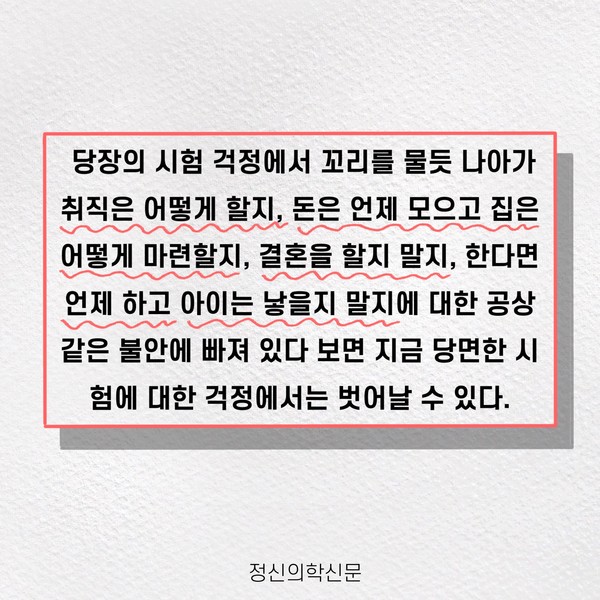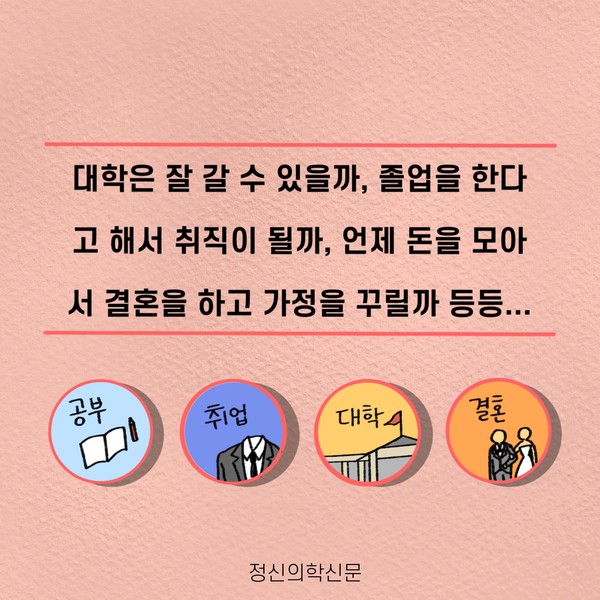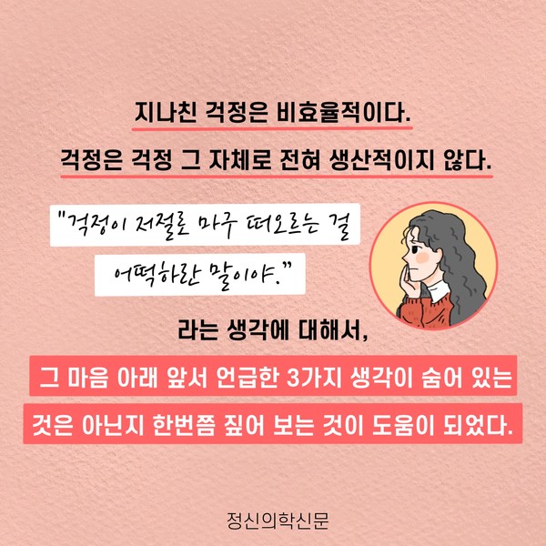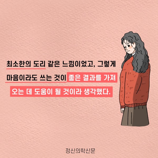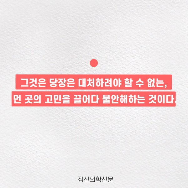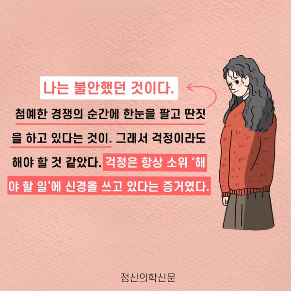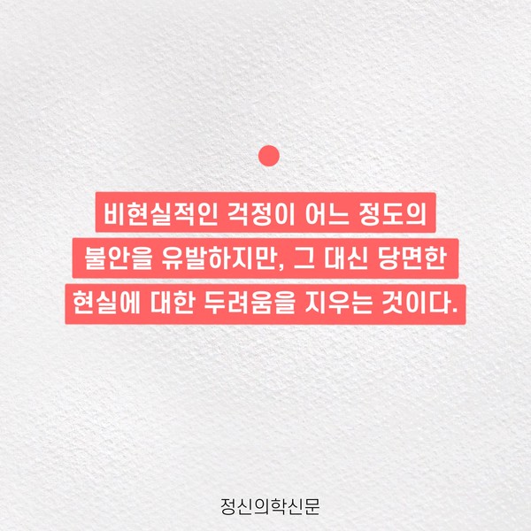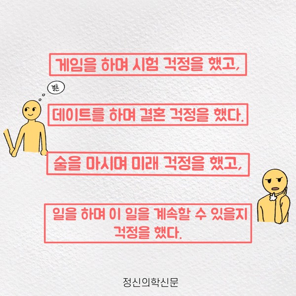 관련기사 계획대로 이루어지는 것 하나 없는 삶, 두려워할 수밖에 없을까? 키워드 #불안 #불안장애 #걱정 #인지왜곡 #인지행동치료 이두형 정신건강의학과 전문의 info.psynews@gmail.com 다른기사 보기 저작권자 © 정신의학신문 무단전재 및 재배포 금지 추천 뉴스 매 맞는 여성 증후군 - 사랑이라는 이름의 폭력이 남기는 상처 얼만큼 운동해야 우울증을 예방할까? 약만으로 부족할 때, 우울증에 효과적인 운동은 이것입니다 영웅의 숨겨진 아픔 - 소방관 트라우마 불안이 쉽게 사라지지 않는 뇌과학적 이유 [신간소개] 당신의 상처는 사적이지 않다 수면다원검사를 꼭 받아봐야 하는 사람 (Part 3) 우울증에 좋은 운동은 뭘까 댓글삭제 삭제한 댓글은 다시 복구할 수 없습니다. 그래도 삭제하시겠습니까? 비밀번호 닫기 기사 댓글 0 댓글 접기 댓글 내용입력 비회원 로그인 이름 비밀번호 댓글 내용입력 댓글쓰기 계정을 선택하시면 로그인·계정인증을 통해 댓글을 남기실 수 있습니다. 회원 로그인 비회원 글쓰기 이름 비밀번호 자동등록방지 로그인 옵션 창닫기 주요기사 대인기피증 사회불안장애 극복하기 [Doctor's Mail] 연속된 사업 실패, 재기를 위해 노력하지만 힘듭니다 아직은 괜찮습니다 6화 나는 언제나 완성되어가는 중이다 불안장애와 공황장애 어떻게 다른가요 수면의 질과 ADHD의 상호작용 약만으로 부족할 때, 우울증에 효과적인 운동은 이것입니다