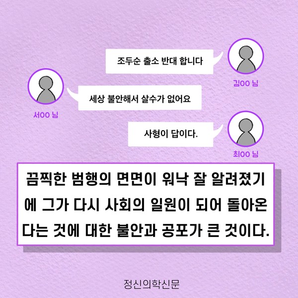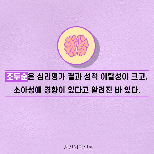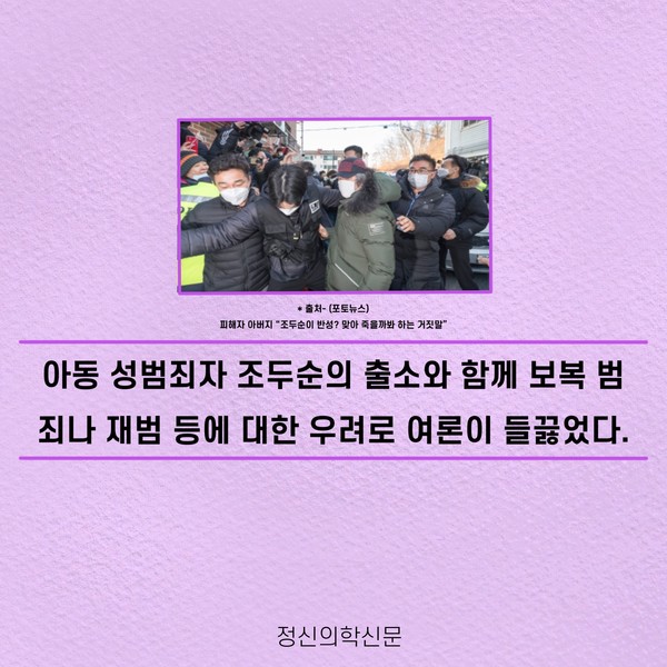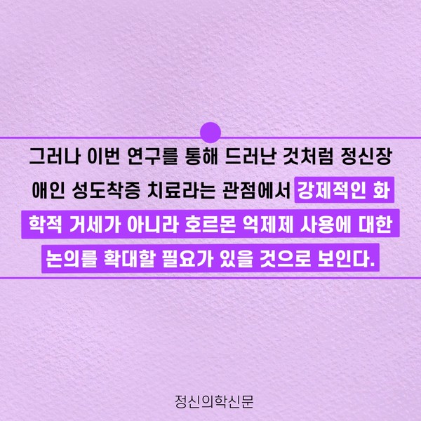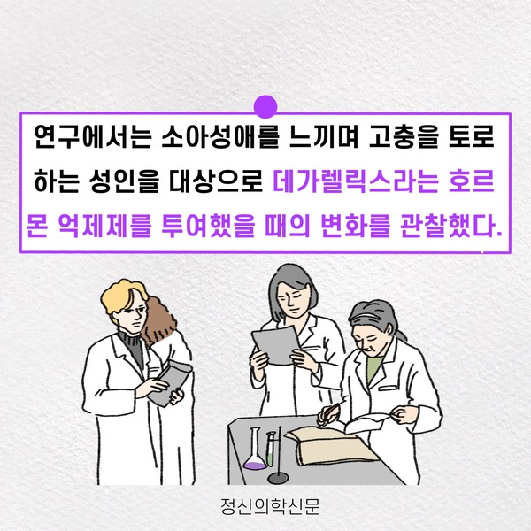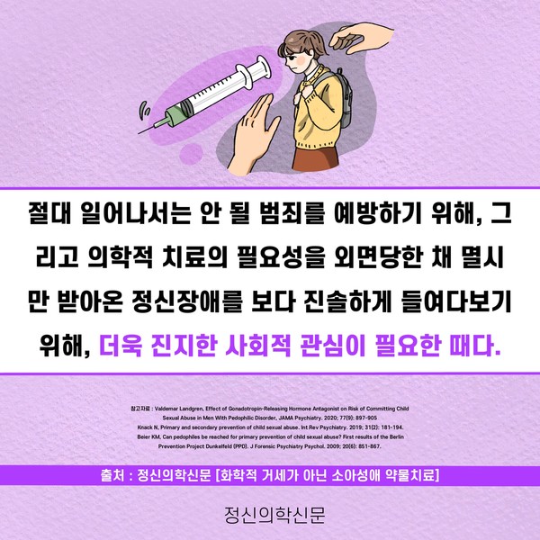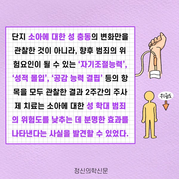 관련기사 화학적 거세가 아닌 소아성애 약물치료 키워드 #소아성애 #화학적거세 #조두순 #호르몬억제 유승준 기자 info.psynews@gmail.com 다른기사 보기 저작권자 © 정신의학신문 무단전재 및 재배포 금지 추천 뉴스 매 맞는 여성 증후군 - 사랑이라는 이름의 폭력이 남기는 상처 얼만큼 운동해야 우울증을 예방할까? 영웅의 숨겨진 아픔 - 소방관 트라우마 약만으로 부족할 때, 우울증에 효과적인 운동은 이것입니다 불안이 쉽게 사라지지 않는 뇌과학적 이유 [신간소개] 당신의 상처는 사적이지 않다 수면다원검사를 꼭 받아봐야 하는 사람 (Part 3) 우울증에 좋은 운동은 뭘까 댓글삭제 삭제한 댓글은 다시 복구할 수 없습니다. 그래도 삭제하시겠습니까? 비밀번호 닫기 기사 댓글 0 댓글 접기 댓글 내용입력 비회원 로그인 이름 비밀번호 댓글 내용입력 댓글쓰기 계정을 선택하시면 로그인·계정인증을 통해 댓글을 남기실 수 있습니다. 회원 로그인 비회원 글쓰기 이름 비밀번호 자동등록방지 로그인 옵션 창닫기 주요기사 대인기피증 사회불안장애 극복하기 [Doctor's Mail] 연속된 사업 실패, 재기를 위해 노력하지만 힘듭니다 아직은 괜찮습니다 6화 나는 언제나 완성되어가는 중이다 불안장애와 공황장애 어떻게 다른가요 수면의 질과 ADHD의 상호작용 약만으로 부족할 때, 우울증에 효과적인 운동은 이것입니다