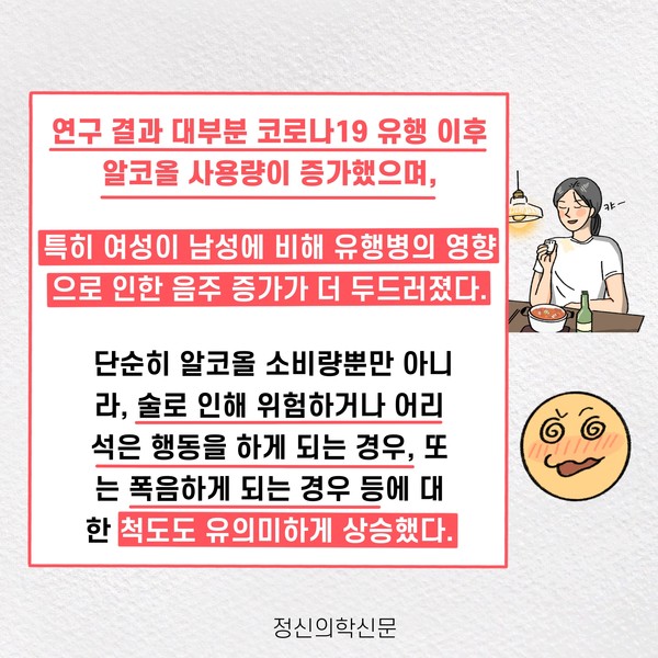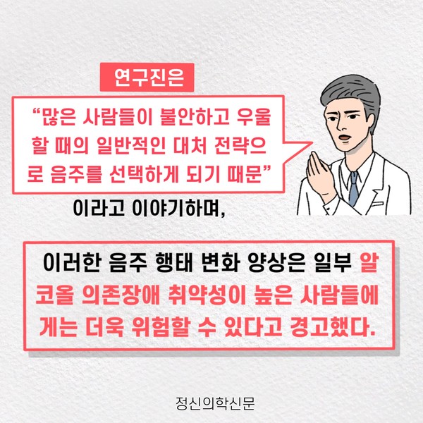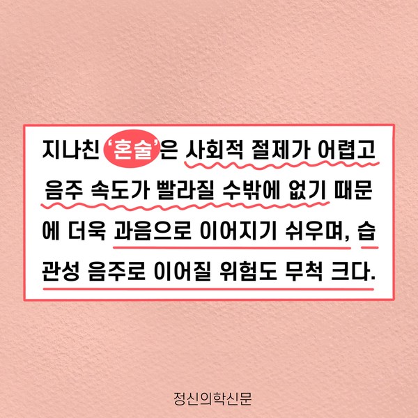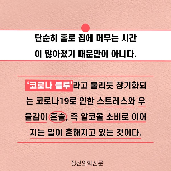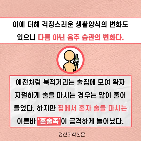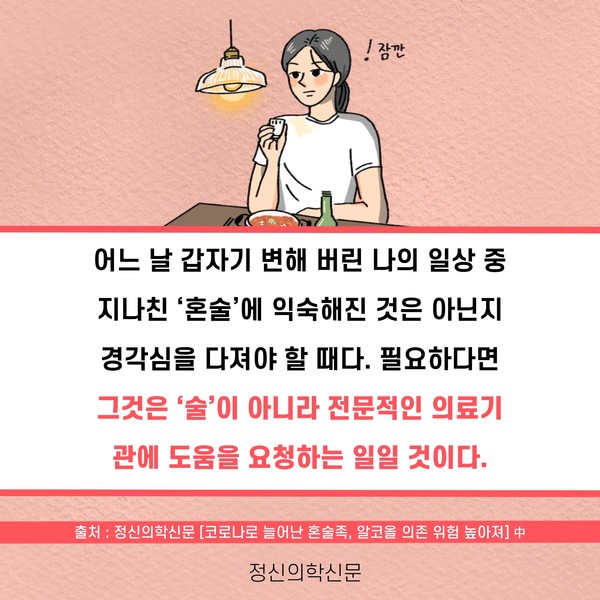 관련기사 코로나로 늘어난 혼술족, 알코올 의존 위험 높아져 키워드 #코로나19 #언택트 #혼술 #혼밥 유승준 기자 info.psynews@gmail.com 다른기사 보기 저작권자 © 정신의학신문 무단전재 및 재배포 금지 추천 뉴스 매 맞는 여성 증후군 - 사랑이라는 이름의 폭력이 남기는 상처 얼만큼 운동해야 우울증을 예방할까? 영웅의 숨겨진 아픔 - 소방관 트라우마 약만으로 부족할 때, 우울증에 효과적인 운동은 이것입니다 불안이 쉽게 사라지지 않는 뇌과학적 이유 [신간소개] 당신의 상처는 사적이지 않다 수면다원검사를 꼭 받아봐야 하는 사람 (Part 3) 우울증에 좋은 운동은 뭘까 댓글삭제 삭제한 댓글은 다시 복구할 수 없습니다. 그래도 삭제하시겠습니까? 비밀번호 닫기 기사 댓글 0 댓글 접기 댓글 내용입력 비회원 로그인 이름 비밀번호 댓글 내용입력 댓글쓰기 계정을 선택하시면 로그인·계정인증을 통해 댓글을 남기실 수 있습니다. 회원 로그인 비회원 글쓰기 이름 비밀번호 자동등록방지 로그인 옵션 창닫기 주요기사 대인기피증 사회불안장애 극복하기 [Doctor's Mail] 연속된 사업 실패, 재기를 위해 노력하지만 힘듭니다 아직은 괜찮습니다 6화 나는 언제나 완성되어가는 중이다 불안장애와 공황장애 어떻게 다른가요 수면의 질과 ADHD의 상호작용 약만으로 부족할 때, 우울증에 효과적인 운동은 이것입니다
