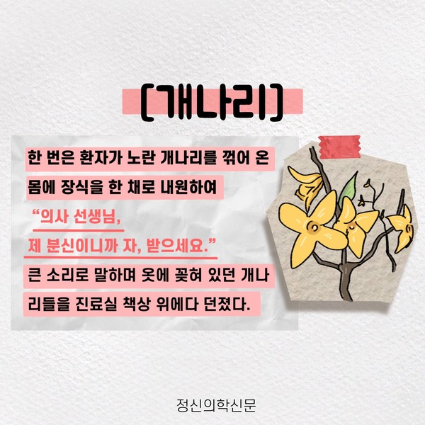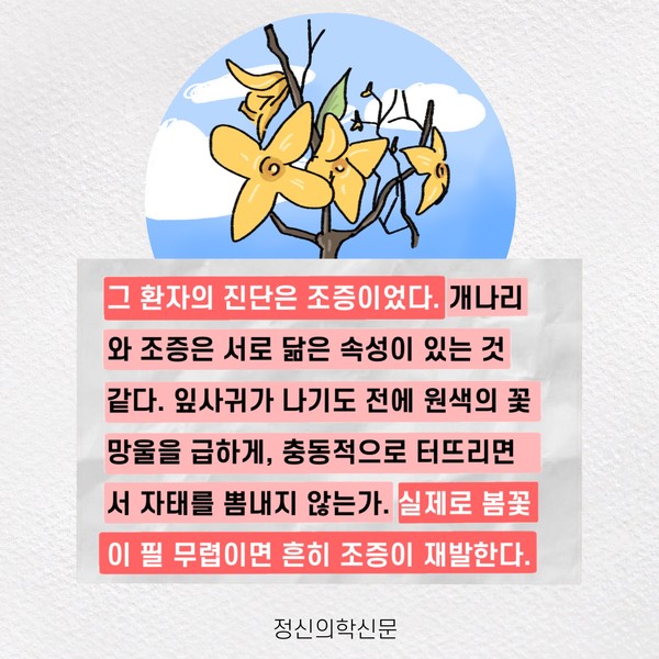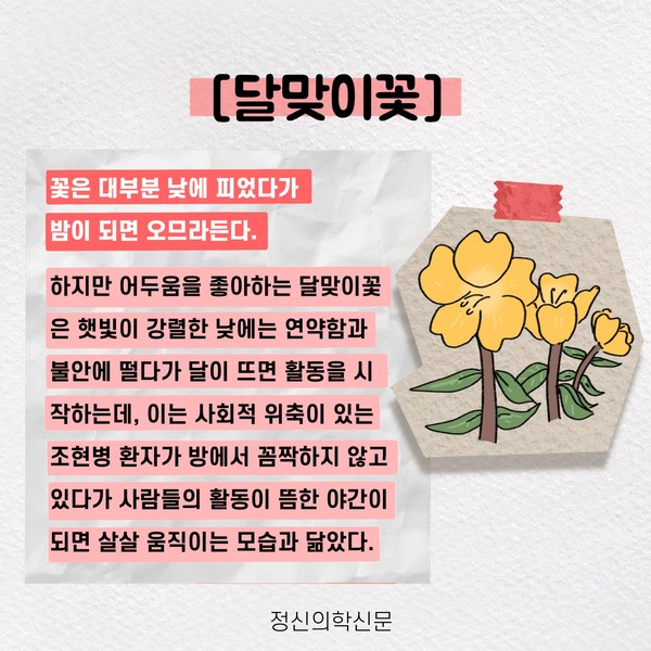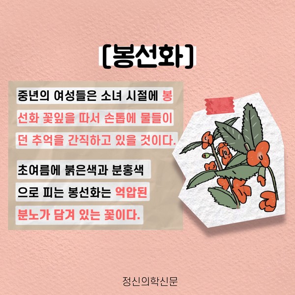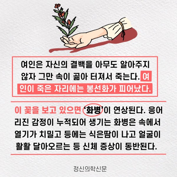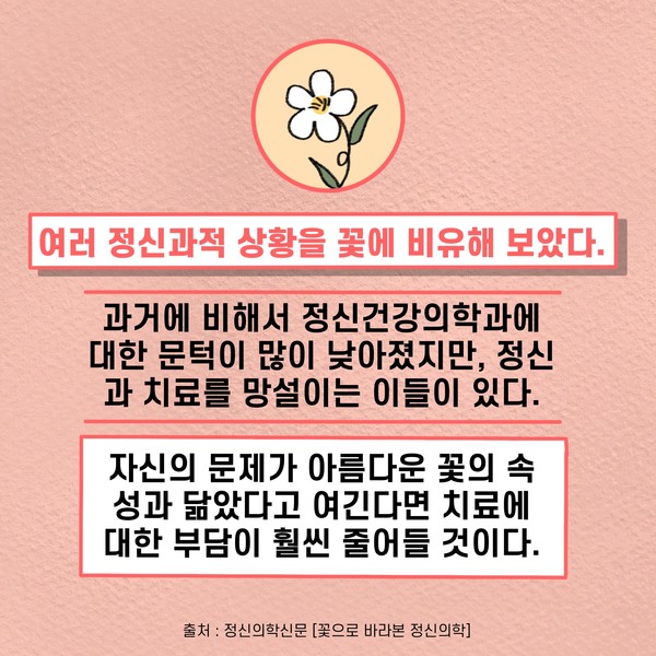 관련기사 꽃으로 바라본 정신의학 키워드 #정신과치료 #정신과진료 #정신과상담 #꽃말 윤경일 정신건강의학과 전문의 info.psynews@gmail.com 다른기사 보기 저작권자 © 정신의학신문 무단전재 및 재배포 금지 추천 뉴스 매 맞는 여성 증후군 - 사랑이라는 이름의 폭력이 남기는 상처 얼만큼 운동해야 우울증을 예방할까? 약만으로 부족할 때, 우울증에 효과적인 운동은 이것입니다 영웅의 숨겨진 아픔 - 소방관 트라우마 불안이 쉽게 사라지지 않는 뇌과학적 이유 [신간소개] 당신의 상처는 사적이지 않다 수면다원검사를 꼭 받아봐야 하는 사람 (Part 3) 우울증에 좋은 운동은 뭘까 댓글삭제 삭제한 댓글은 다시 복구할 수 없습니다. 그래도 삭제하시겠습니까? 비밀번호 닫기 기사 댓글 0 댓글 접기 댓글 내용입력 비회원 로그인 이름 비밀번호 댓글 내용입력 댓글쓰기 계정을 선택하시면 로그인·계정인증을 통해 댓글을 남기실 수 있습니다. 회원 로그인 비회원 글쓰기 이름 비밀번호 자동등록방지 로그인 옵션 창닫기 주요기사 대인기피증 사회불안장애 극복하기 [Doctor's Mail] 연속된 사업 실패, 재기를 위해 노력하지만 힘듭니다 아직은 괜찮습니다 6화 나는 언제나 완성되어가는 중이다 불안장애와 공황장애 어떻게 다른가요 수면의 질과 ADHD의 상호작용 약만으로 부족할 때, 우울증에 효과적인 운동은 이것입니다