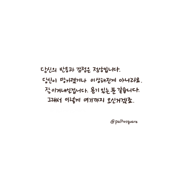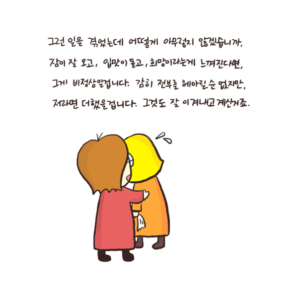 응원 작가의 말 / 당신의 숨은 힘을 믿습니다. 키워드 #정신건강의학과 #정신과 #심리학 #심리 #심리툰 #응원 #용기 팔호광장 Instagram@palhosquare 다른기사 보기 저작권자 © 정신의학신문 무단전재 및 재배포 금지 추천 뉴스 매 맞는 여성 증후군 - 사랑이라는 이름의 폭력이 남기는 상처 얼만큼 운동해야 우울증을 예방할까? 약만으로 부족할 때, 우울증에 효과적인 운동은 이것입니다 영웅의 숨겨진 아픔 - 소방관 트라우마 불안이 쉽게 사라지지 않는 뇌과학적 이유 [신간소개] 당신의 상처는 사적이지 않다 수면다원검사를 꼭 받아봐야 하는 사람 (Part 3) 우울증에 좋은 운동은 뭘까 댓글삭제 삭제한 댓글은 다시 복구할 수 없습니다. 그래도 삭제하시겠습니까? 비밀번호 닫기 기사 댓글 0 댓글 접기 댓글 내용입력 비회원 로그인 이름 비밀번호 댓글 내용입력 댓글쓰기 계정을 선택하시면 로그인·계정인증을 통해 댓글을 남기실 수 있습니다. 회원 로그인 비회원 글쓰기 이름 비밀번호 자동등록방지 로그인 옵션 창닫기 주요기사 대인기피증 사회불안장애 극복하기 [Doctor's Mail] 연속된 사업 실패, 재기를 위해 노력하지만 힘듭니다 아직은 괜찮습니다 6화 나는 언제나 완성되어가는 중이다 불안장애와 공황장애 어떻게 다른가요 수면의 질과 ADHD의 상호작용 약만으로 부족할 때, 우울증에 효과적인 운동은 이것입니다