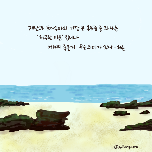 소중한 것은 일시적입니다. 작가의 말 / 모두 건강하세요. 오래오래 일시적이시기를. 키워드 #정신건강의학과 #정신과 #심리학 #심리 #재난 #트라우마 #회복 #응원 #치료 팔호광장 Instagram@palhosquare 다른기사 보기 저작권자 © 정신의학신문 무단전재 및 재배포 금지 추천 뉴스 매 맞는 여성 증후군 - 사랑이라는 이름의 폭력이 남기는 상처 얼만큼 운동해야 우울증을 예방할까? 약만으로 부족할 때, 우울증에 효과적인 운동은 이것입니다 영웅의 숨겨진 아픔 - 소방관 트라우마 불안이 쉽게 사라지지 않는 뇌과학적 이유 [신간소개] 당신의 상처는 사적이지 않다 수면다원검사를 꼭 받아봐야 하는 사람 (Part 3) 우울증에 좋은 운동은 뭘까 댓글삭제 삭제한 댓글은 다시 복구할 수 없습니다. 그래도 삭제하시겠습니까? 비밀번호 닫기 기사 댓글 0 댓글 접기 댓글 내용입력 비회원 로그인 이름 비밀번호 댓글 내용입력 댓글쓰기 계정을 선택하시면 로그인·계정인증을 통해 댓글을 남기실 수 있습니다. 회원 로그인 비회원 글쓰기 이름 비밀번호 자동등록방지 로그인 옵션 창닫기 주요기사 대인기피증 사회불안장애 극복하기 [Doctor's Mail] 연속된 사업 실패, 재기를 위해 노력하지만 힘듭니다 아직은 괜찮습니다 6화 나는 언제나 완성되어가는 중이다 불안장애와 공황장애 어떻게 다른가요 수면의 질과 ADHD의 상호작용 약만으로 부족할 때, 우울증에 효과적인 운동은 이것입니다