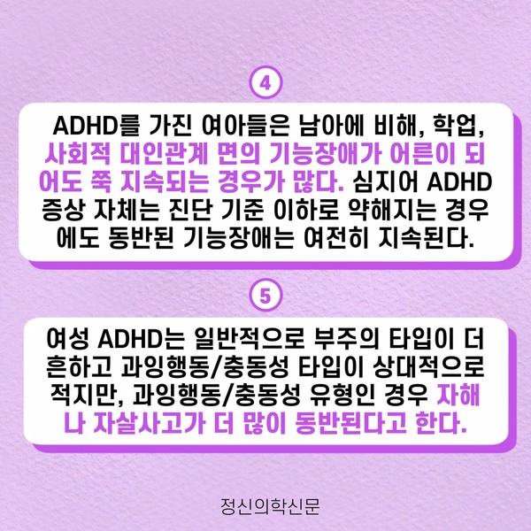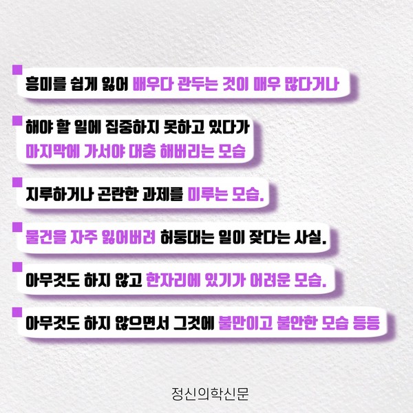 관련기사 증거는 없지만 증상은 있었다 키워드 #ADHD #성인ADHD #강박증 이현정 정신건강의학과 전문의 info.psynews@gmail.com 다른기사 보기 저작권자 © 정신의학신문 무단전재 및 재배포 금지 추천 뉴스 매 맞는 여성 증후군 - 사랑이라는 이름의 폭력이 남기는 상처 얼만큼 운동해야 우울증을 예방할까? 약만으로 부족할 때, 우울증에 효과적인 운동은 이것입니다 영웅의 숨겨진 아픔 - 소방관 트라우마 불안이 쉽게 사라지지 않는 뇌과학적 이유 [신간소개] 당신의 상처는 사적이지 않다 수면다원검사를 꼭 받아봐야 하는 사람 (Part 3) 우울증에 좋은 운동은 뭘까 댓글삭제 삭제한 댓글은 다시 복구할 수 없습니다. 그래도 삭제하시겠습니까? 비밀번호 닫기 기사 댓글 0 댓글 접기 댓글 내용입력 비회원 로그인 이름 비밀번호 댓글 내용입력 댓글쓰기 계정을 선택하시면 로그인·계정인증을 통해 댓글을 남기실 수 있습니다. 회원 로그인 비회원 글쓰기 이름 비밀번호 자동등록방지 로그인 옵션 창닫기 주요기사 대인기피증 사회불안장애 극복하기 [Doctor's Mail] 연속된 사업 실패, 재기를 위해 노력하지만 힘듭니다 아직은 괜찮습니다 6화 나는 언제나 완성되어가는 중이다 불안장애와 공황장애 어떻게 다른가요 수면의 질과 ADHD의 상호작용 약만으로 부족할 때, 우울증에 효과적인 운동은 이것입니다