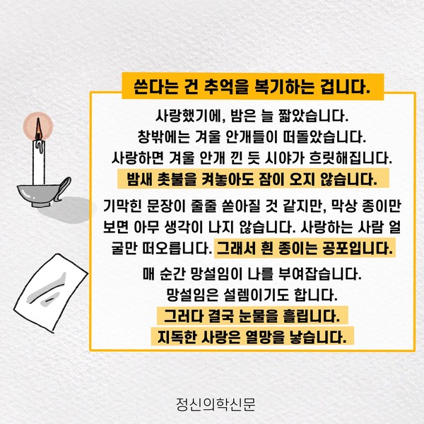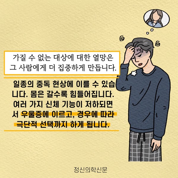 추천 뉴스 매 맞는 여성 증후군 - 사랑이라는 이름의 폭력이 남기는 상처 얼만큼 운동해야 우울증을 예방할까? 약만으로 부족할 때, 우울증에 효과적인 운동은 이것입니다 영웅의 숨겨진 아픔 - 소방관 트라우마 불안이 쉽게 사라지지 않는 뇌과학적 이유 [신간소개] 당신의 상처는 사적이지 않다 수면다원검사를 꼭 받아봐야 하는 사람 (Part 3)
