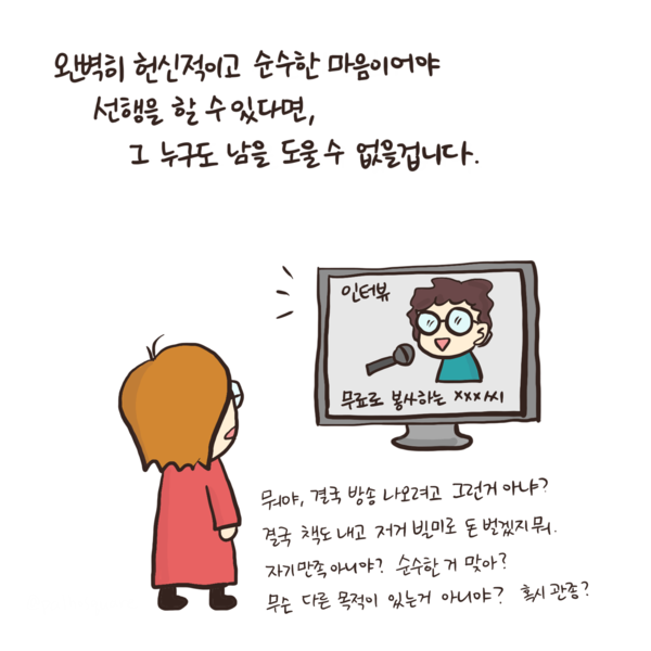 남을 돕고싶다면, 작가의 말 / 조금이라도 실천하는게 세상엔 도움이 됩니다. 키워드 #정신건강의학과 #정신과 #심리학 #심리 #상담 #재능기부 #기능재부 #심리툰 팔호광장 Instagram@palhosquare 다른기사 보기 저작권자 © 정신의학신문 무단전재 및 재배포 금지 추천 뉴스 매 맞는 여성 증후군 - 사랑이라는 이름의 폭력이 남기는 상처 얼만큼 운동해야 우울증을 예방할까? 약만으로 부족할 때, 우울증에 효과적인 운동은 이것입니다 영웅의 숨겨진 아픔 - 소방관 트라우마 불안이 쉽게 사라지지 않는 뇌과학적 이유 [신간소개] 당신의 상처는 사적이지 않다 수면다원검사를 꼭 받아봐야 하는 사람 (Part 3) 우울증에 좋은 운동은 뭘까 댓글삭제 삭제한 댓글은 다시 복구할 수 없습니다. 그래도 삭제하시겠습니까? 비밀번호 닫기 기사 댓글 0 댓글 접기 댓글 내용입력 비회원 로그인 이름 비밀번호 댓글 내용입력 댓글쓰기 계정을 선택하시면 로그인·계정인증을 통해 댓글을 남기실 수 있습니다. 회원 로그인 비회원 글쓰기 이름 비밀번호 자동등록방지 로그인 옵션 창닫기 주요기사 대인기피증 사회불안장애 극복하기 [Doctor's Mail] 연속된 사업 실패, 재기를 위해 노력하지만 힘듭니다 아직은 괜찮습니다 6화 나는 언제나 완성되어가는 중이다 불안장애와 공황장애 어떻게 다른가요 수면의 질과 ADHD의 상호작용 약만으로 부족할 때, 우울증에 효과적인 운동은 이것입니다