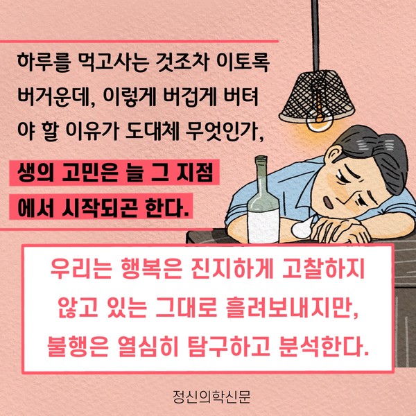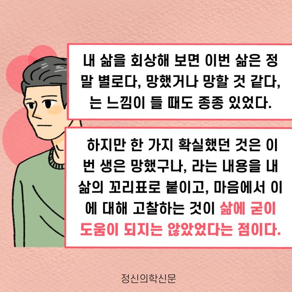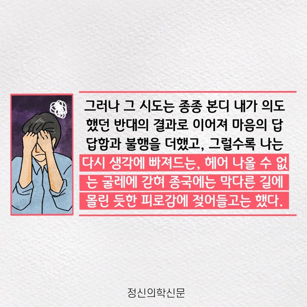 관련기사 망한 여행과 망할 일이 생긴 여행; 내 인생은 망했어, 라는 생각에 힘들다면 키워드 #불행 #행복 #우울함 이두형 정신건강의학과 전문의 info.psynews@gmail.com 다른기사 보기 저작권자 © 정신의학신문 무단전재 및 재배포 금지 추천 뉴스 매 맞는 여성 증후군 - 사랑이라는 이름의 폭력이 남기는 상처 얼만큼 운동해야 우울증을 예방할까? 약만으로 부족할 때, 우울증에 효과적인 운동은 이것입니다 영웅의 숨겨진 아픔 - 소방관 트라우마 불안이 쉽게 사라지지 않는 뇌과학적 이유 [신간소개] 당신의 상처는 사적이지 않다 수면다원검사를 꼭 받아봐야 하는 사람 (Part 3) 우울증에 좋은 운동은 뭘까 댓글삭제 삭제한 댓글은 다시 복구할 수 없습니다. 그래도 삭제하시겠습니까? 비밀번호 닫기 기사 댓글 0 댓글 접기 댓글 내용입력 비회원 로그인 이름 비밀번호 댓글 내용입력 댓글쓰기 계정을 선택하시면 로그인·계정인증을 통해 댓글을 남기실 수 있습니다. 회원 로그인 비회원 글쓰기 이름 비밀번호 자동등록방지 로그인 옵션 창닫기 주요기사 대인기피증 사회불안장애 극복하기 [Doctor's Mail] 연속된 사업 실패, 재기를 위해 노력하지만 힘듭니다 아직은 괜찮습니다 6화 나는 언제나 완성되어가는 중이다 불안장애와 공황장애 어떻게 다른가요 수면의 질과 ADHD의 상호작용 약만으로 부족할 때, 우울증에 효과적인 운동은 이것입니다