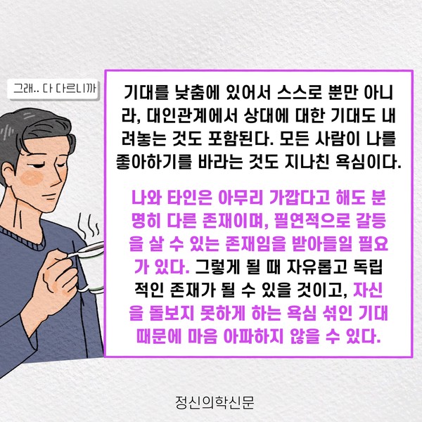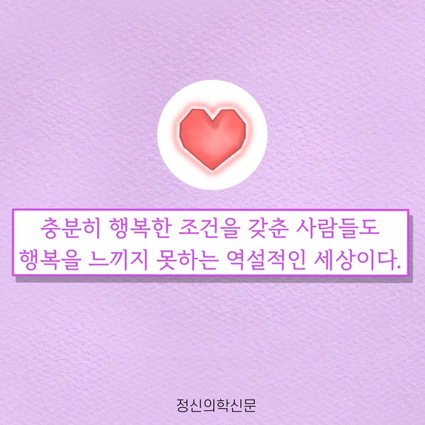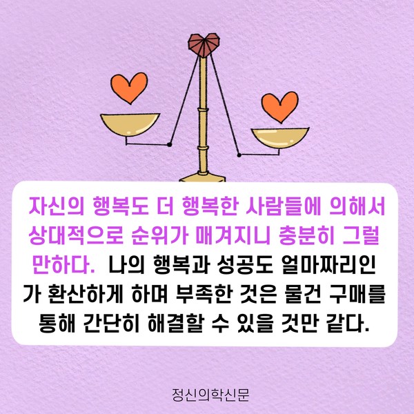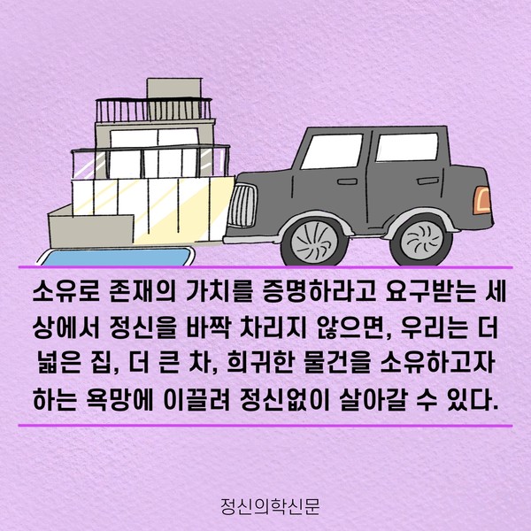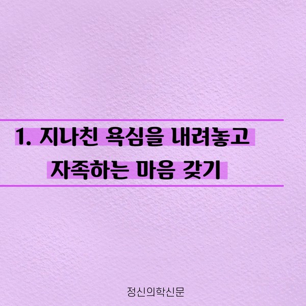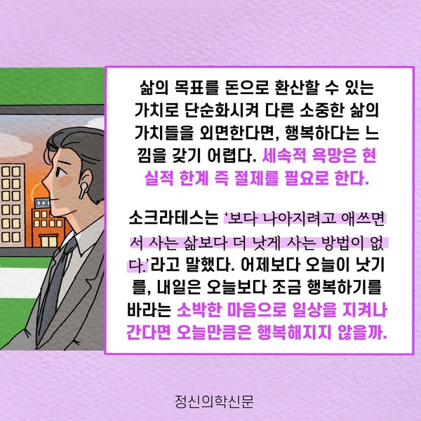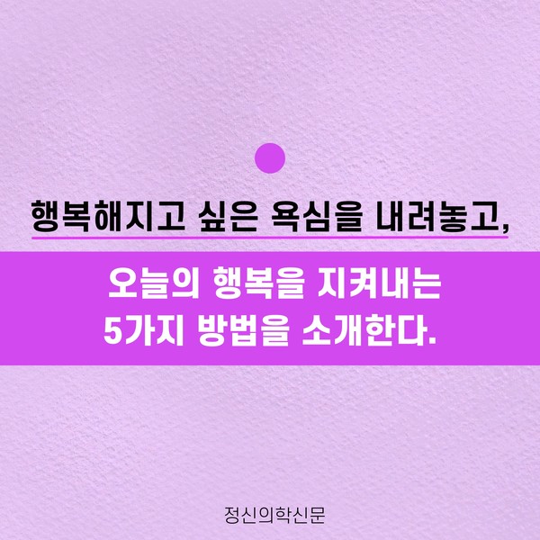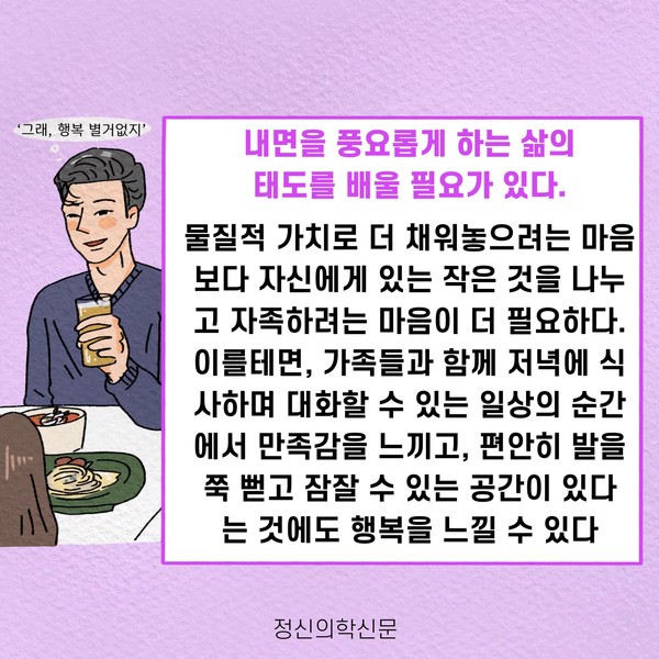 관련기사 오늘의 행복을 지켜내는 5가지 방법 키워드 #행복 #소유욕 #물욕 #자족 이상수 정신건강의학과 전문의 info.psynews@gmail.com 다른기사 보기 저작권자 © 정신의학신문 무단전재 및 재배포 금지 추천 뉴스 매 맞는 여성 증후군 - 사랑이라는 이름의 폭력이 남기는 상처 얼만큼 운동해야 우울증을 예방할까? 약만으로 부족할 때, 우울증에 효과적인 운동은 이것입니다 영웅의 숨겨진 아픔 - 소방관 트라우마 불안이 쉽게 사라지지 않는 뇌과학적 이유 [신간소개] 당신의 상처는 사적이지 않다 수면다원검사를 꼭 받아봐야 하는 사람 (Part 3) 우울증에 좋은 운동은 뭘까 댓글삭제 삭제한 댓글은 다시 복구할 수 없습니다. 그래도 삭제하시겠습니까? 비밀번호 닫기 기사 댓글 0 댓글 접기 댓글 내용입력 비회원 로그인 이름 비밀번호 댓글 내용입력 댓글쓰기 계정을 선택하시면 로그인·계정인증을 통해 댓글을 남기실 수 있습니다. 회원 로그인 비회원 글쓰기 이름 비밀번호 자동등록방지 로그인 옵션 창닫기 주요기사 대인기피증 사회불안장애 극복하기 [Doctor's Mail] 연속된 사업 실패, 재기를 위해 노력하지만 힘듭니다 아직은 괜찮습니다 6화 나는 언제나 완성되어가는 중이다 불안장애와 공황장애 어떻게 다른가요 수면의 질과 ADHD의 상호작용 약만으로 부족할 때, 우울증에 효과적인 운동은 이것입니다