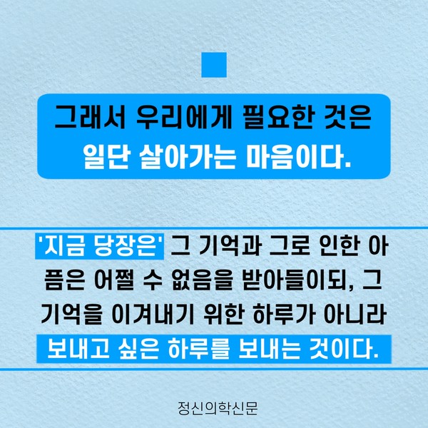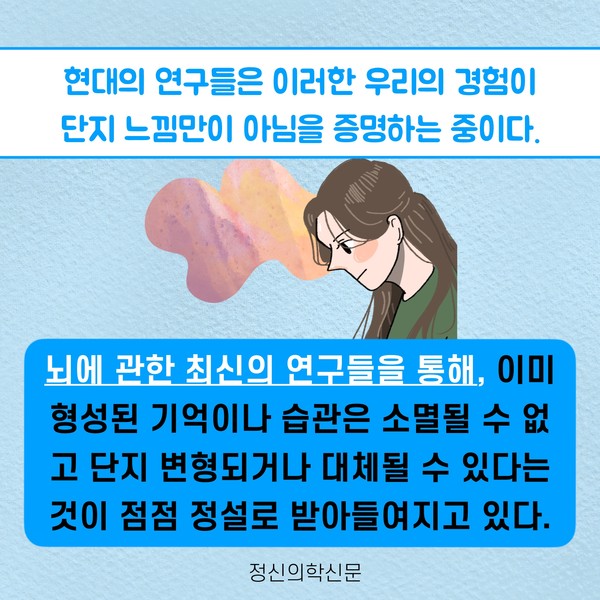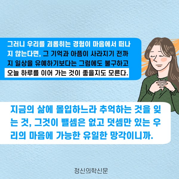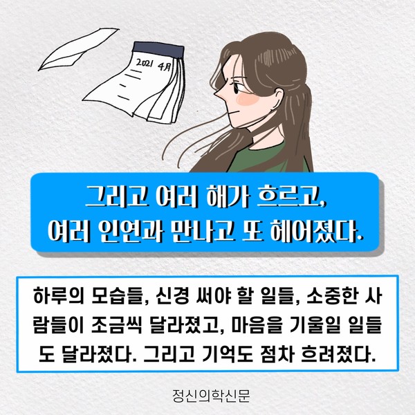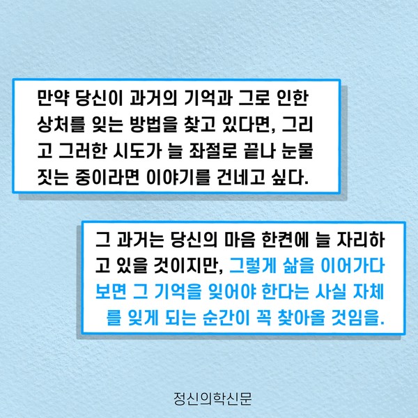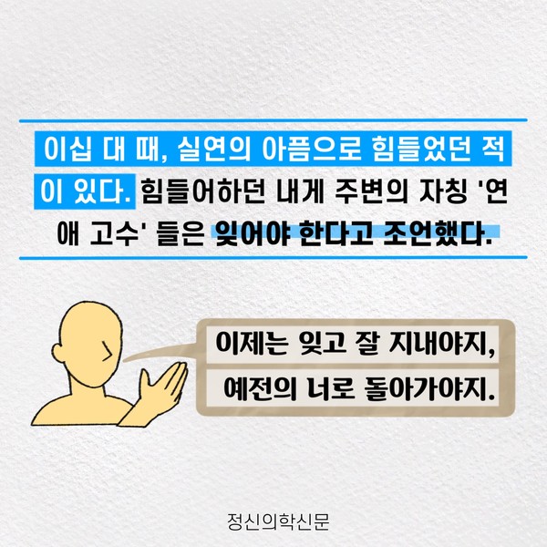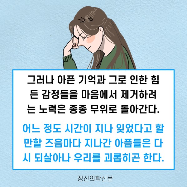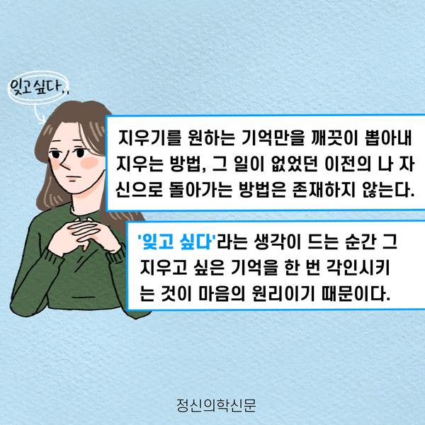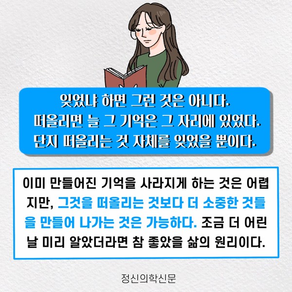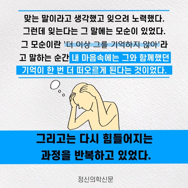 관련기사 마음에는 빼기가 아닌 더하기만 가능하다. 키워드 #아픈기억 #파블로프의개 #이별 #추억 이두형 정신건강의학과 전문의 info.psynews@gmail.com 다른기사 보기 저작권자 © 정신의학신문 무단전재 및 재배포 금지 추천 뉴스 매 맞는 여성 증후군 - 사랑이라는 이름의 폭력이 남기는 상처 얼만큼 운동해야 우울증을 예방할까? 약만으로 부족할 때, 우울증에 효과적인 운동은 이것입니다 영웅의 숨겨진 아픔 - 소방관 트라우마 불안이 쉽게 사라지지 않는 뇌과학적 이유 [신간소개] 당신의 상처는 사적이지 않다 수면다원검사를 꼭 받아봐야 하는 사람 (Part 3) 우울증에 좋은 운동은 뭘까 댓글삭제 삭제한 댓글은 다시 복구할 수 없습니다. 그래도 삭제하시겠습니까? 비밀번호 닫기 기사 댓글 0 댓글 접기 댓글 내용입력 비회원 로그인 이름 비밀번호 댓글 내용입력 댓글쓰기 계정을 선택하시면 로그인·계정인증을 통해 댓글을 남기실 수 있습니다. 회원 로그인 비회원 글쓰기 이름 비밀번호 자동등록방지 로그인 옵션 창닫기 주요기사 대인기피증 사회불안장애 극복하기 [Doctor's Mail] 연속된 사업 실패, 재기를 위해 노력하지만 힘듭니다 아직은 괜찮습니다 6화 나는 언제나 완성되어가는 중이다 불안장애와 공황장애 어떻게 다른가요 수면의 질과 ADHD의 상호작용 약만으로 부족할 때, 우울증에 효과적인 운동은 이것입니다