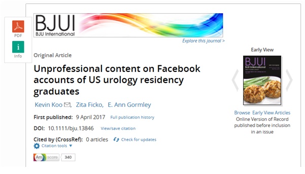 미국 뉴햄프셔 레바논에 소재한 다트머스-히치콕 메디컬센터의 비뇨기과 의사인 Kevin Koo 등은 의사들이 온라인상에서 직업적 윤리지침에 따라 적절하게 행동하고 있는지 확인하기 위한 연구를 시행하였다. 연구팀은 2015년에 비뇨기과 레지던트 과정을 수료한 281명의 의사들 중 공공으로 접근 가능한 201명의 페이스북을 점검하였다. 그들은 페이스북이 워낙 유명하고 13세 이상이면 누구나 쉽게 접근 가능하기에 많은 SNS 중에 페이스북을 선택하였다고 설명하였다.