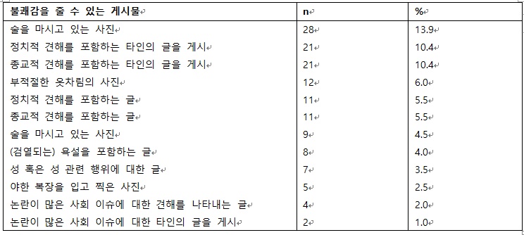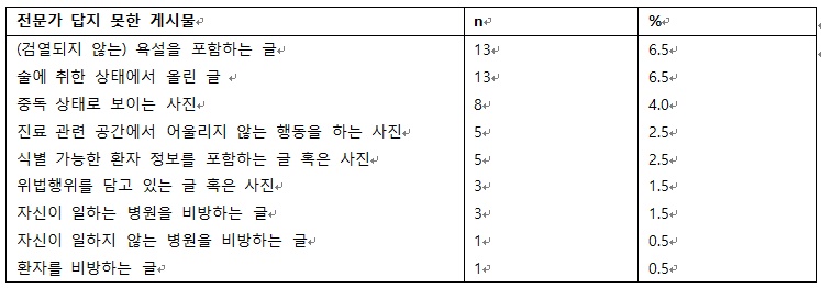 연구 결과 201명 중 80명(40%)의 페이스북 계정에서 전문가 답지 못하거나 독자에게 불쾌감을 줄 수 있는 컨텐츠를 게시하고 있었다. 특히 이 중 27개(13%)의 계정에서는 욕설, 위법행위, 식별 가능한 환자 정보 등을 포함하는 콘텐츠를 게시하고 있어 심각성을 확인할 수 있었다.