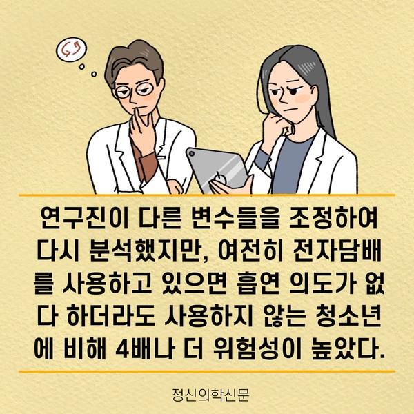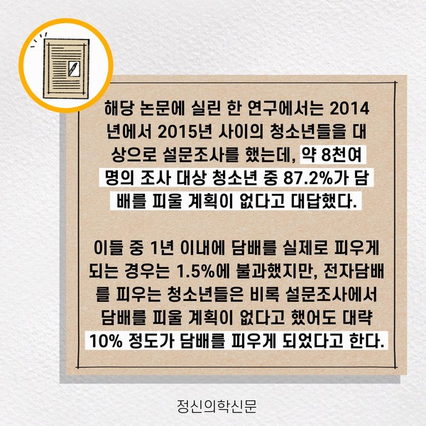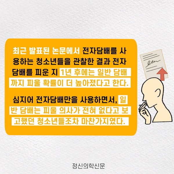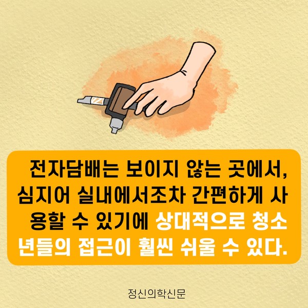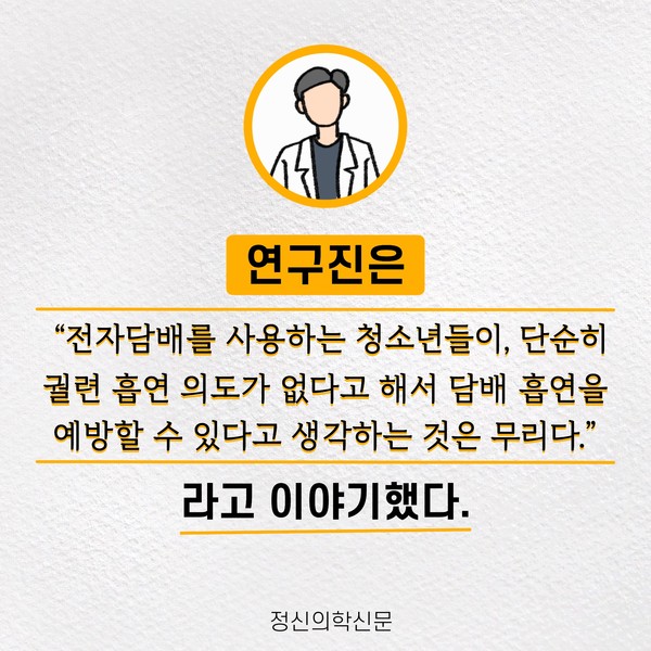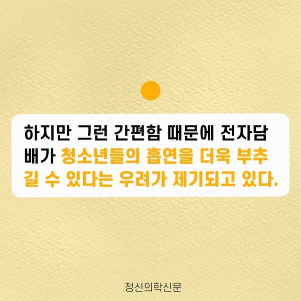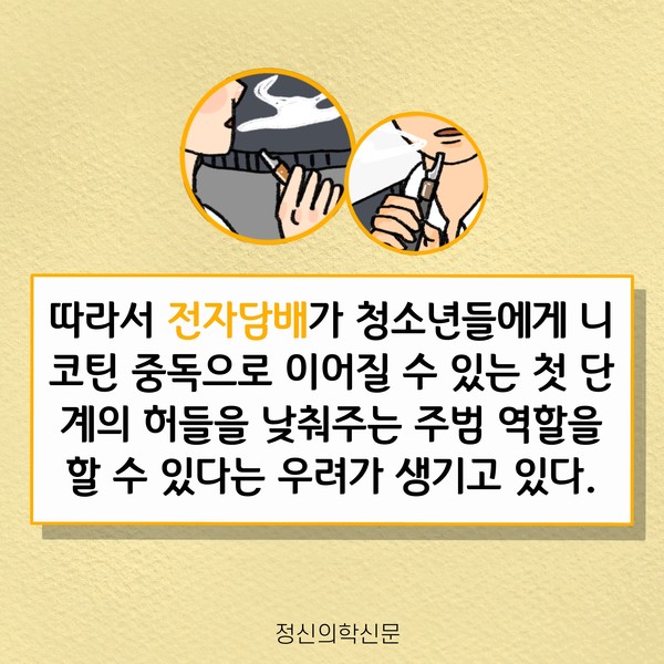 관련기사 니코틴 중독으로 가는 첫 단추, 전자담배 키워드 #전자담배 #연초 #궐련 #청소년흡연 #금연 유승준 기자 info.psynews@gmail.com 다른기사 보기 저작권자 © 정신의학신문 무단전재 및 재배포 금지 추천 뉴스 매 맞는 여성 증후군 - 사랑이라는 이름의 폭력이 남기는 상처 얼만큼 운동해야 우울증을 예방할까? 영웅의 숨겨진 아픔 - 소방관 트라우마 약만으로 부족할 때, 우울증에 효과적인 운동은 이것입니다 불안이 쉽게 사라지지 않는 뇌과학적 이유 [신간소개] 당신의 상처는 사적이지 않다 수면다원검사를 꼭 받아봐야 하는 사람 (Part 3) 우울증에 좋은 운동은 뭘까 댓글삭제 삭제한 댓글은 다시 복구할 수 없습니다. 그래도 삭제하시겠습니까? 비밀번호 닫기 기사 댓글 0 댓글 접기 댓글 내용입력 비회원 로그인 이름 비밀번호 댓글 내용입력 댓글쓰기 계정을 선택하시면 로그인·계정인증을 통해 댓글을 남기실 수 있습니다. 회원 로그인 비회원 글쓰기 이름 비밀번호 자동등록방지 로그인 옵션 창닫기 주요기사 대인기피증 사회불안장애 극복하기 [Doctor's Mail] 연속된 사업 실패, 재기를 위해 노력하지만 힘듭니다 아직은 괜찮습니다 6화 나는 언제나 완성되어가는 중이다 불안장애와 공황장애 어떻게 다른가요 수면의 질과 ADHD의 상호작용 약만으로 부족할 때, 우울증에 효과적인 운동은 이것입니다