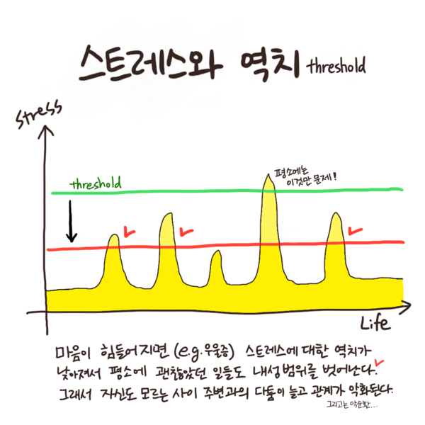 역치 : 반응을 일으키는데 필요한 최소한의 자극 세기 작가의 말 / 요즘 짜증이 늘었나요? 키워드 #정신건강의학과 #정신과 #심리학 #심리 #스트레스 #역치 #게임 팔호광장 Instagram@palhosquare 다른기사 보기 저작권자 © 정신의학신문 무단전재 및 재배포 금지 추천 뉴스 매 맞는 여성 증후군 - 사랑이라는 이름의 폭력이 남기는 상처 얼만큼 운동해야 우울증을 예방할까? 약만으로 부족할 때, 우울증에 효과적인 운동은 이것입니다 영웅의 숨겨진 아픔 - 소방관 트라우마 불안이 쉽게 사라지지 않는 뇌과학적 이유 [신간소개] 당신의 상처는 사적이지 않다 수면다원검사를 꼭 받아봐야 하는 사람 (Part 3) 우울증에 좋은 운동은 뭘까 댓글삭제 삭제한 댓글은 다시 복구할 수 없습니다. 그래도 삭제하시겠습니까? 비밀번호 닫기 기사 댓글 0 댓글 접기 댓글 내용입력 비회원 로그인 이름 비밀번호 댓글 내용입력 댓글쓰기 계정을 선택하시면 로그인·계정인증을 통해 댓글을 남기실 수 있습니다. 회원 로그인 비회원 글쓰기 이름 비밀번호 자동등록방지 로그인 옵션 창닫기 주요기사 대인기피증 사회불안장애 극복하기 [Doctor's Mail] 연속된 사업 실패, 재기를 위해 노력하지만 힘듭니다 아직은 괜찮습니다 6화 나는 언제나 완성되어가는 중이다 불안장애와 공황장애 어떻게 다른가요 수면의 질과 ADHD의 상호작용 약만으로 부족할 때, 우울증에 효과적인 운동은 이것입니다