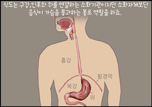 식도는 구강, 인후와 위를 연결하는 소화기간입니다. 하지만 소화를 직접하는 것은 아니고 음식이 가슴을 통과하게끔 하는 통로 역할을 합니다.